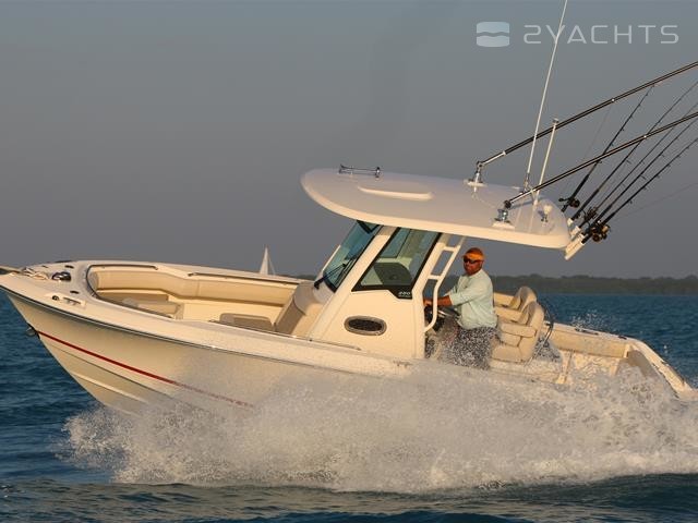Der Boston Whaler 250 Outrage ist mit zwei Außenbordmotoren mit einer Leistung von 200, 225 PS ausgestattet Das Fassungsvermögen des Kraftstofftanks beträgt 651 Liter, der Frischwassertank 99 Liter.
