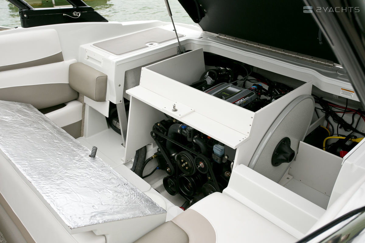 Die Crownline 225 SS ist mit einer wasserdichten Jensen-Stereoanlage mit Feuchtigkeitsschutz ausgestattet. Der Entwickler empfiehlt, Mercruiser-Motoren mit einer Leistung von 250 bis 350 PS auf einem Bugfahrer zu installieren. Das Fassungsvermögen des Kraftstofftanks beträgt 170 Liter, und das Fassungsvermögen für die Wasserspeicherung ist nicht vorgesehen.