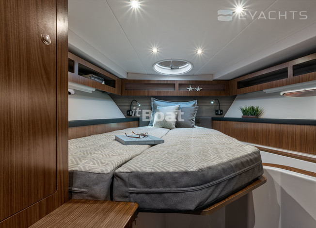 Durch eine Glasschiebetür können Sie das Cockpit und den Salon trennen oder zu einem gemeinsamen Raum kombinieren. Die Kabine hat Panoramaverglasungen um den Umfang, Glas bedeckt fast den gesamten Bereich der Schotte. Das Hardtop hat zwei große öffnende Oberlichter. In der Essecke mit einem Ecksofa und einem Doppeltisch auf der Steuerbordseite befindet sich unter der Scharnierplatte aus Kunststein eine Kombüse mit Herd, Kühlschrank und Mikrowelle.