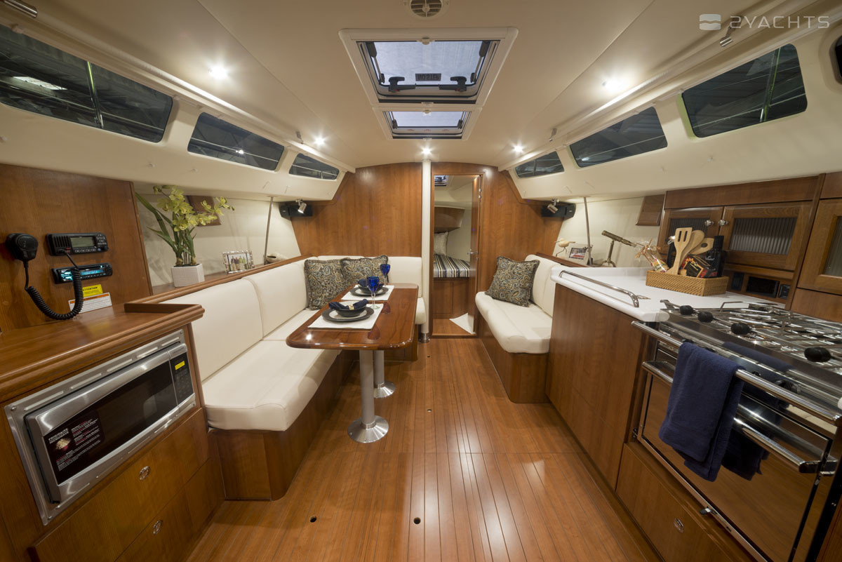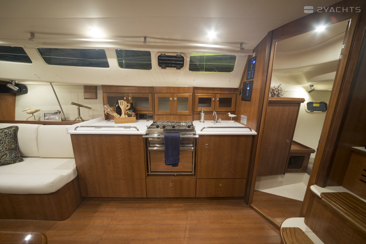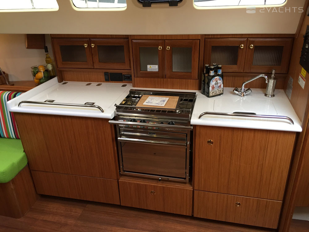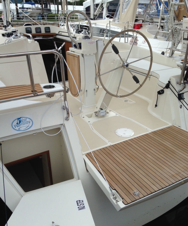 Das Heck des Modells ist mit einer Plattform mit einer Klappleiter für den Zugang zum Wasser und einem Anhänger ausgestattet. An den Seiten befinden sich Durchgänge zum Bug, die mit Metallgeländern eingezäunt sind. Die Segelfläche des Schiffes beträgt 54 m². Es ist mit einem stationären 21 PS Motor ausgestattet. Der Kraftstofftank fasst 94,6 Liter und der Frischwassertank 189,3 Meter.
