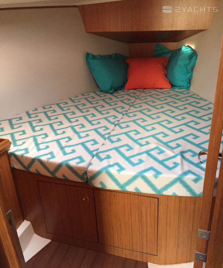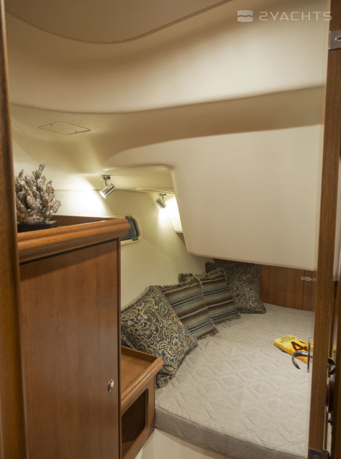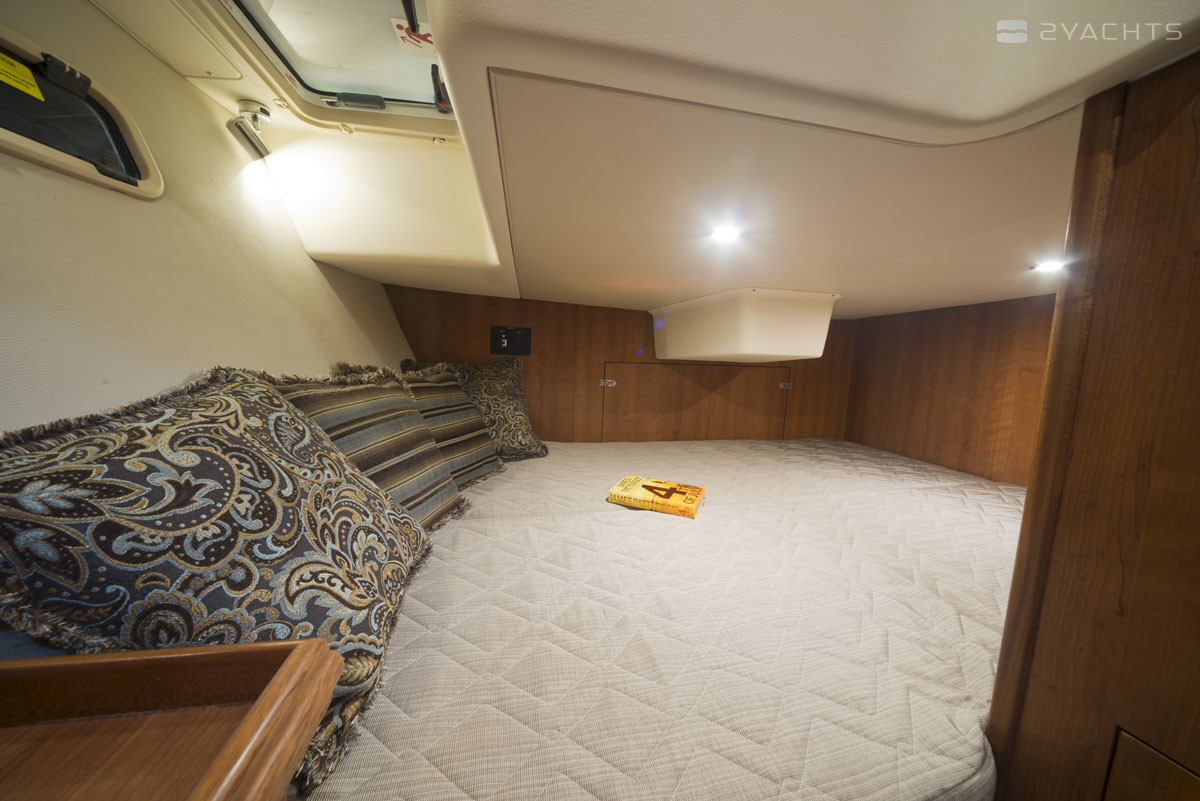 Am Bug des Marlow-Hunter 31 befindet sich eine geräumige Kabine mit einem Doppelbett, mehreren Schubladen für persönliche Gegenstände, einem Kleiderschrank und einem kompakten Tisch. Es gibt eine zweite Kabine an Steuerbord von der Eingangstreppe, die ein Bett für zwei und geräumige Schließfächer hat.