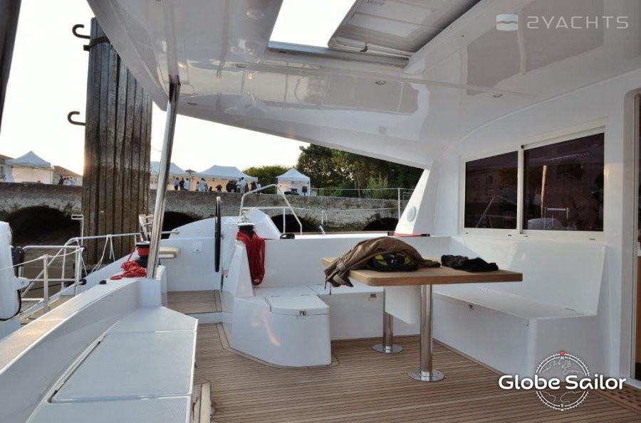 Das Heck des Nautitech 542 ist mit zwei abgestuften Startplattformen und einer Anhängerkupplung ausgestattet. Im Cockpit befinden sich weiche Sessel und Sofas, ein Schreibtisch und ein modernes Bedienfeld. Die Eingänge zu den Kabinen befinden sich an den Seiten.