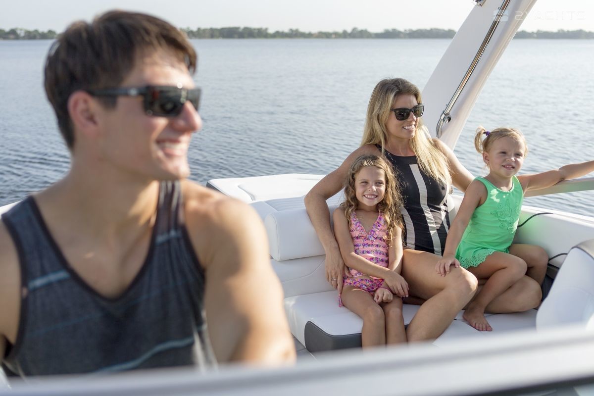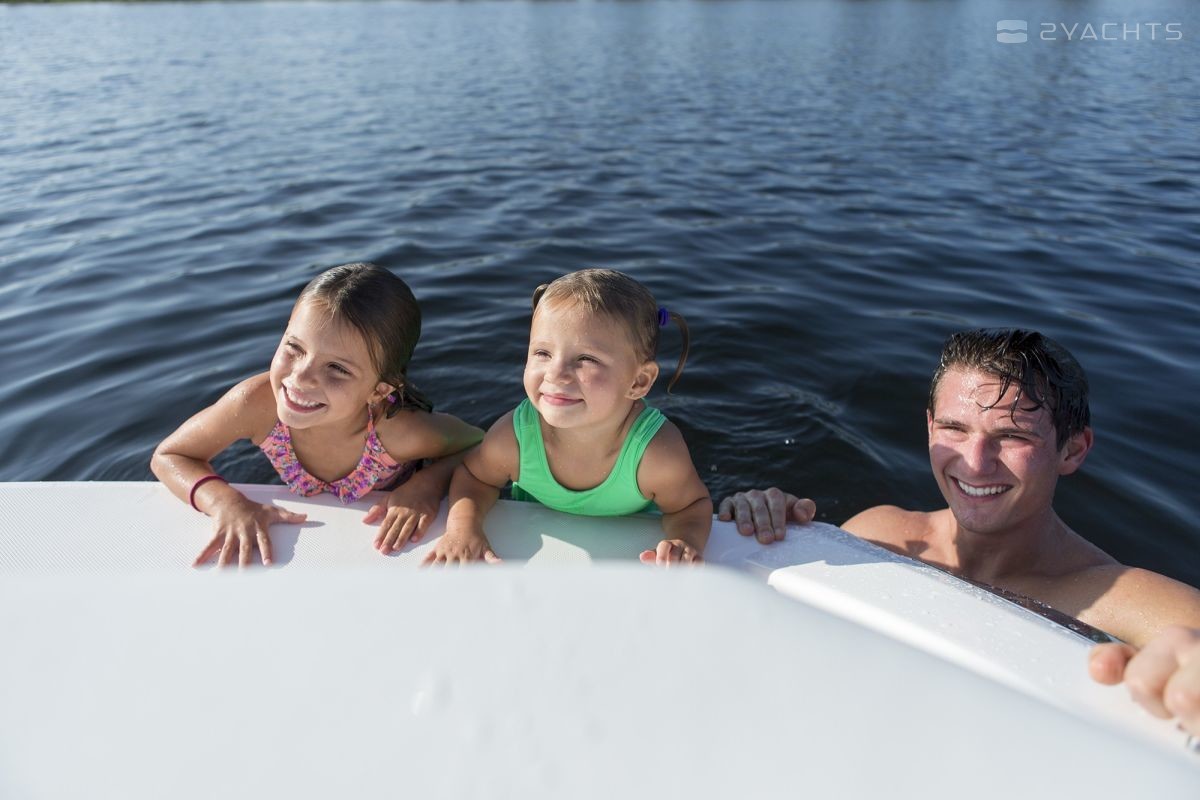 Auf dem Deck befinden sich Schließfächer zur Aufbewahrung von Ausrüstung, Ankern und Kabeln. Das Boot ist mit einer hydraulischen Badeplattform mit Gangway zum Starten sowie einer Bimini-Markise mit Edelstahlgestellen ausgestattet. Optional kann ein Faltbogen in weißer oder schwarzer Farbe installiert werden.