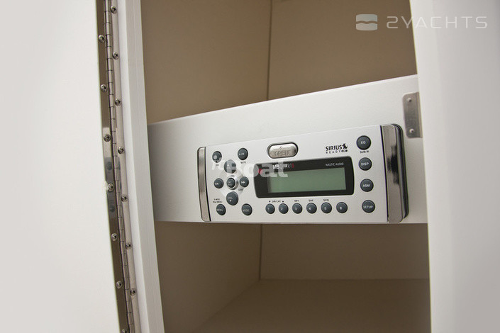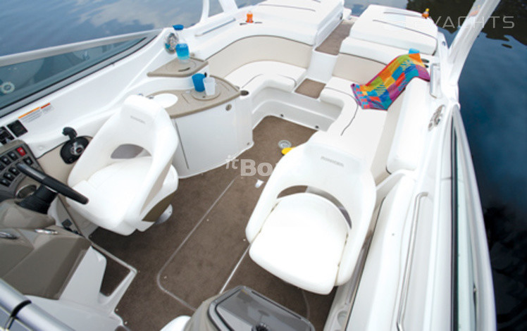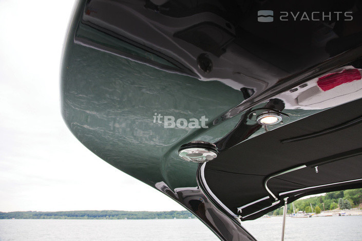 Im Bug des Decks befinden sich zwei Liegestühle, Stühle, die vom Mittelteil aus erreichbar sind, wenn Sie den mittleren Teil der Verglasung der Kabine zur Seite bewegen. Unmittelbar dahinter befindet sich eine Kapitänsbrücke mit einer Steuerkonsole und einem Lenkrad. Für den Kapitän ist ein beweglicher Stuhl im Sportstil installiert, und der gleiche Stuhl ist auf der linken Seite des Bretts installiert. Im Cockpit befinden sich ein halbrundes Sofa und eine Minibar an Steuerbord. Unmittelbar hinter dem Sofa befinden sich Sonnenliegen, die Abdeckungen des Motorraums, und zwei kleine Sonnenliegen am Heck mit Schließfächern zur Aufbewahrung von Gegenständen und Ausrüstung. Vom Cockpit entlang des Ganges zwischen den beiden Rastplätzen gelangen Sie zur Badeplattform.