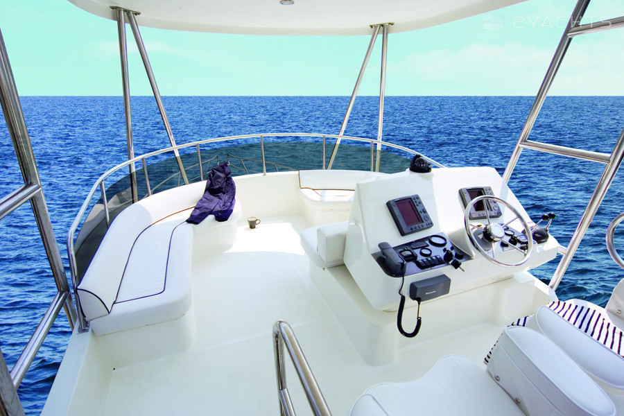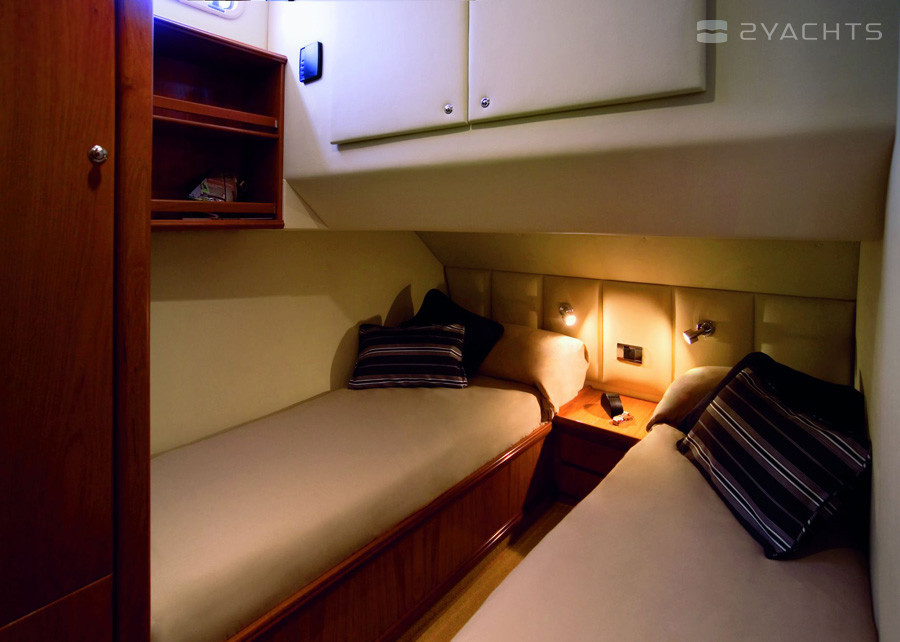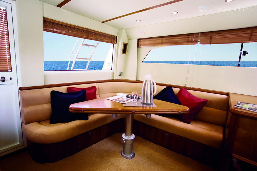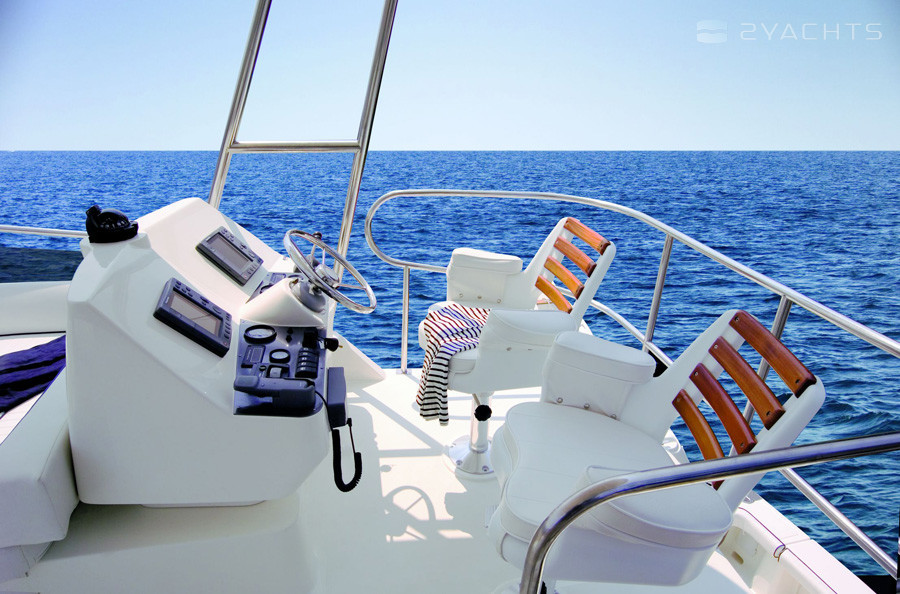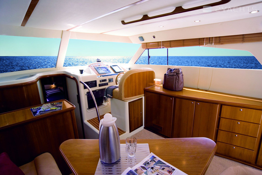 Auf dem Deck des Bootes sind bequeme Seitenwege durch hohe Dachreling geschützt, eine Ladungsbefestigung ist über die gesamte Länge vorgesehen, ein Sonnenbereich am Bug, eine Badeplattform und eine Leiter zum Klettern auf die Flybridge am Heck, zwei Kabinen und ein Gemeinschaftsbad auf dem Unterdeck. Die Flybridge ist durch eine harte Markise und eine Windschutzscheibe geschützt und enthält: einen Kontrollposten mit Doppellenkgetriebe und integrierter Navigationsausrüstung, Lenksitze und Seitensitze mit Liegestuhl.