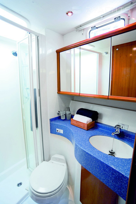 In der Kabine befinden sich: ein zweiter Kontrollposten und ein Esszimmer mit einer Essecke, einem Verwandlungstisch und einem Kühlschrank. Das Badezimmer verfügt über eine Toilette, eine Dusche und ein Waschbecken, eine Kombüse, ein Herd, eine Mikrowelle, Küchenutensilien und einen Kühlschrank. Die Hauptkabine hat ein Doppelbett und Schränke für Dinge, in der Gästekabine - zwei Einzelbetten.