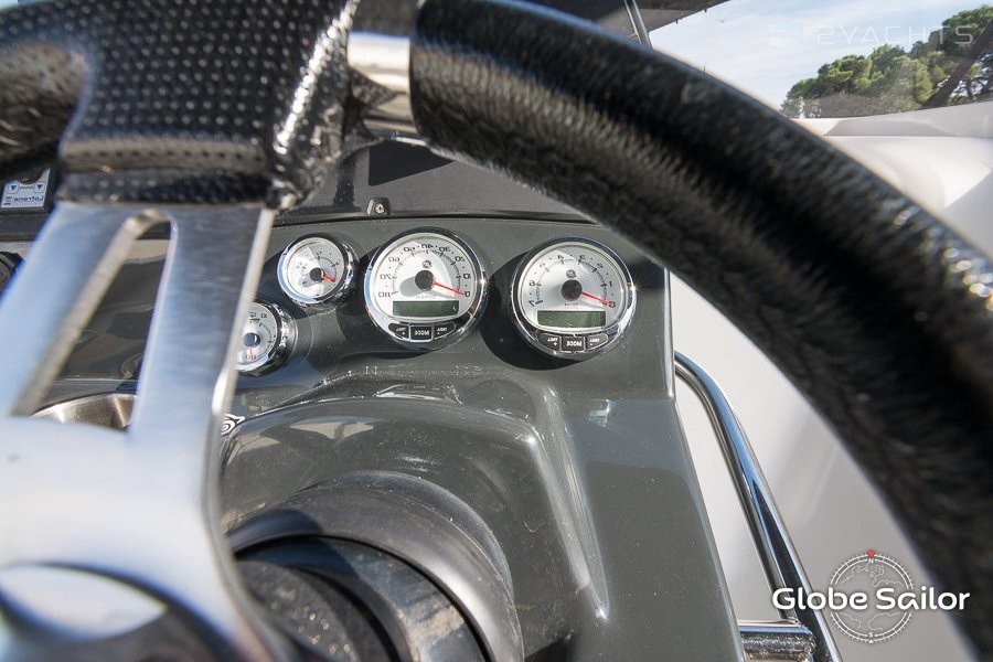 La estación de control está equipada con dirección hidráulica, una toma de corriente eléctrica de 12 V, un mecanismo de marcha atrás y gas y una cómoda silla de capitán. En la parte inferior de la cubierta hay cabañas para cuatro personas con camas dobles, estantes, gabinetes y grandes ojos de buey. Se proporciona una bomba automática para bombear agua de sentina.