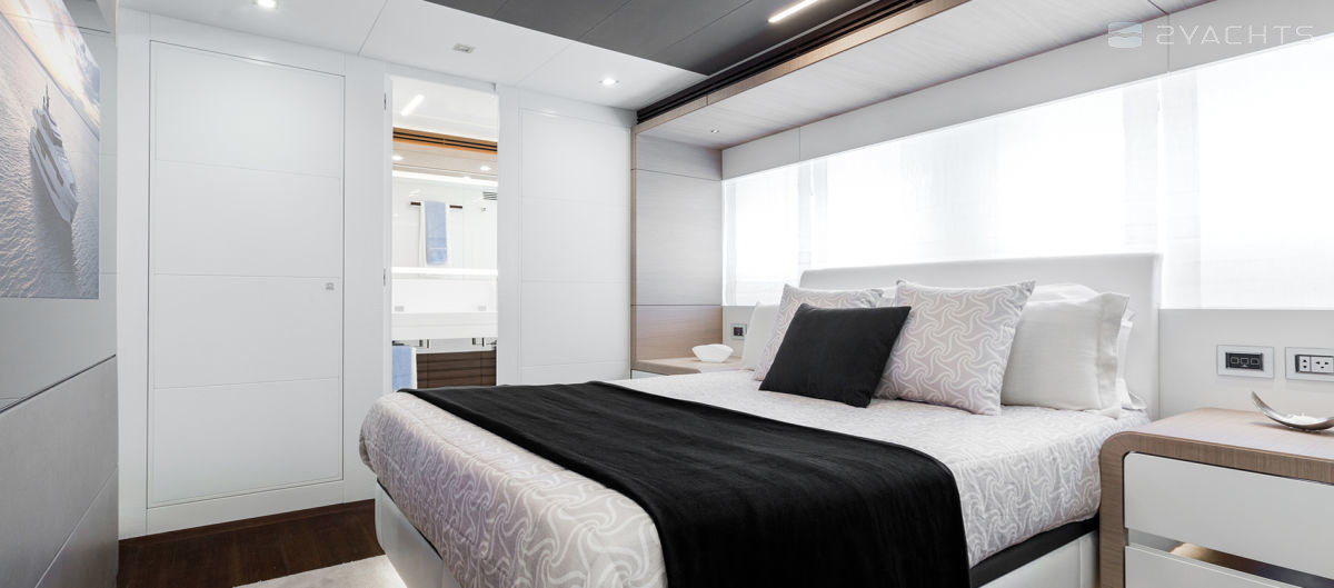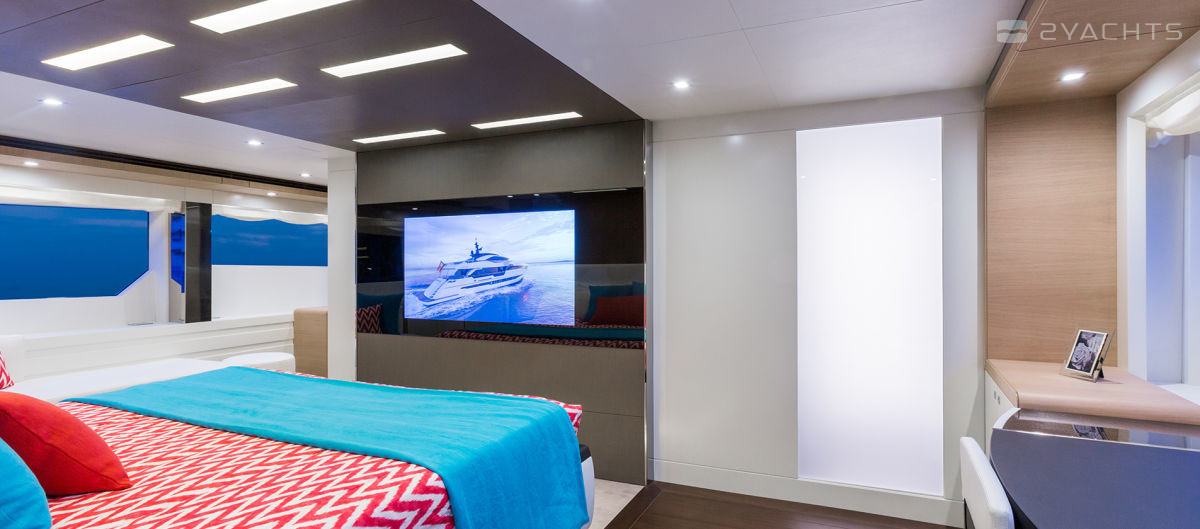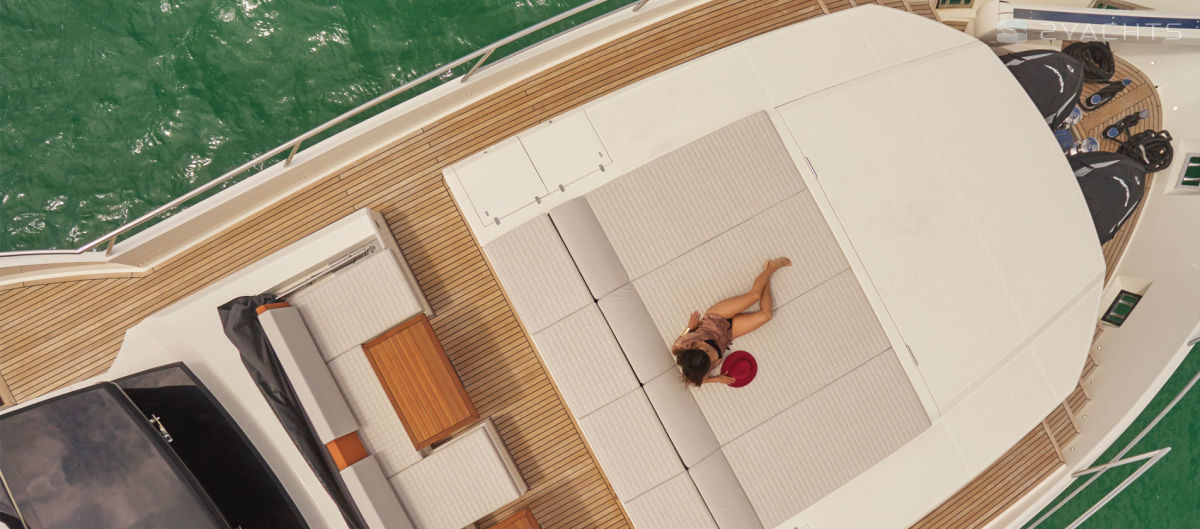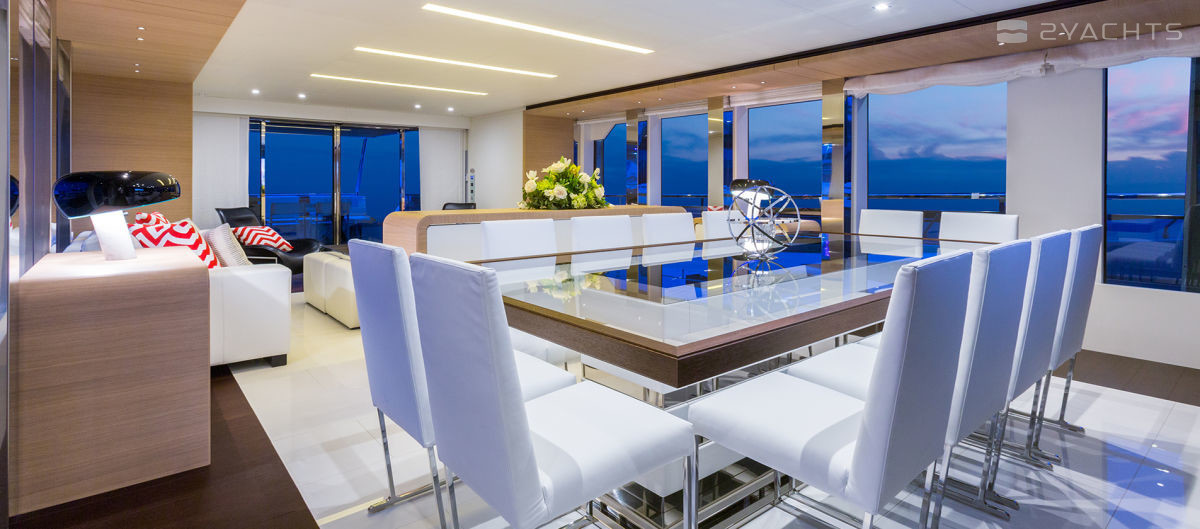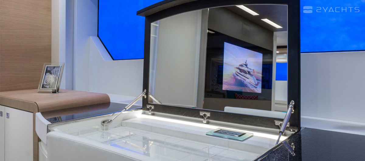En el flybridge hay una zona de sofás y una cocina con barra de bar, un parque eólico y una parrilla de barbacoa. En la proa hay una sala de estar. Desde él, a través de una puerta transparente, hay un pasaje al salón con acristalamiento panorámico, donde hay un comedor con dos sofás y mesas. Por la noche, gracias a los LED, puede crear un efecto de cielo estrellado en la cabina. Hay un televisor de pantalla panorámica, cuya pantalla, cuando se utiliza el sistema Masterbolt, puede servir como sala de cine.