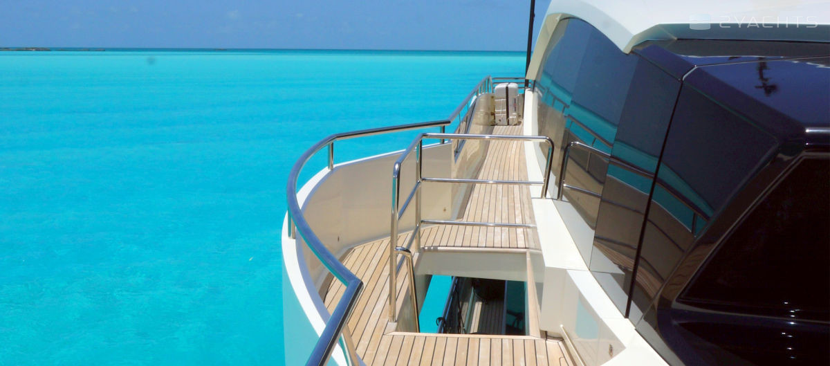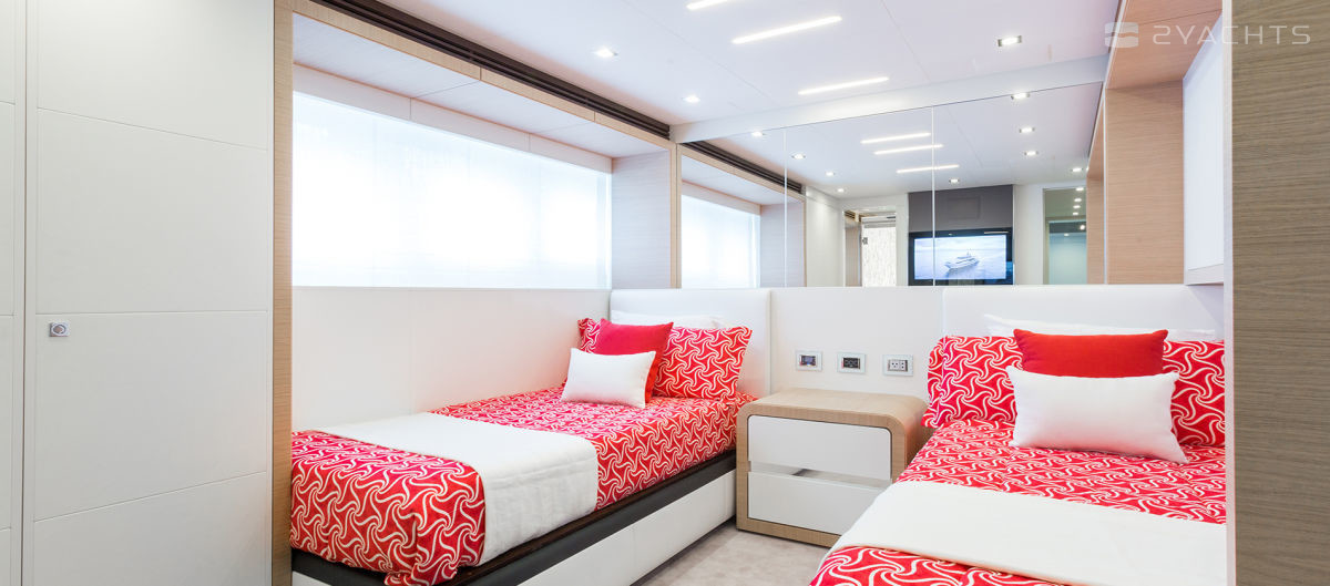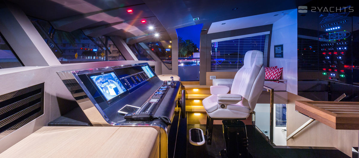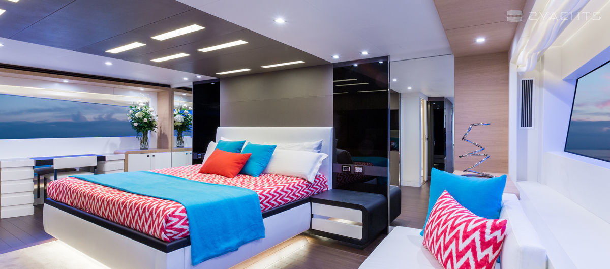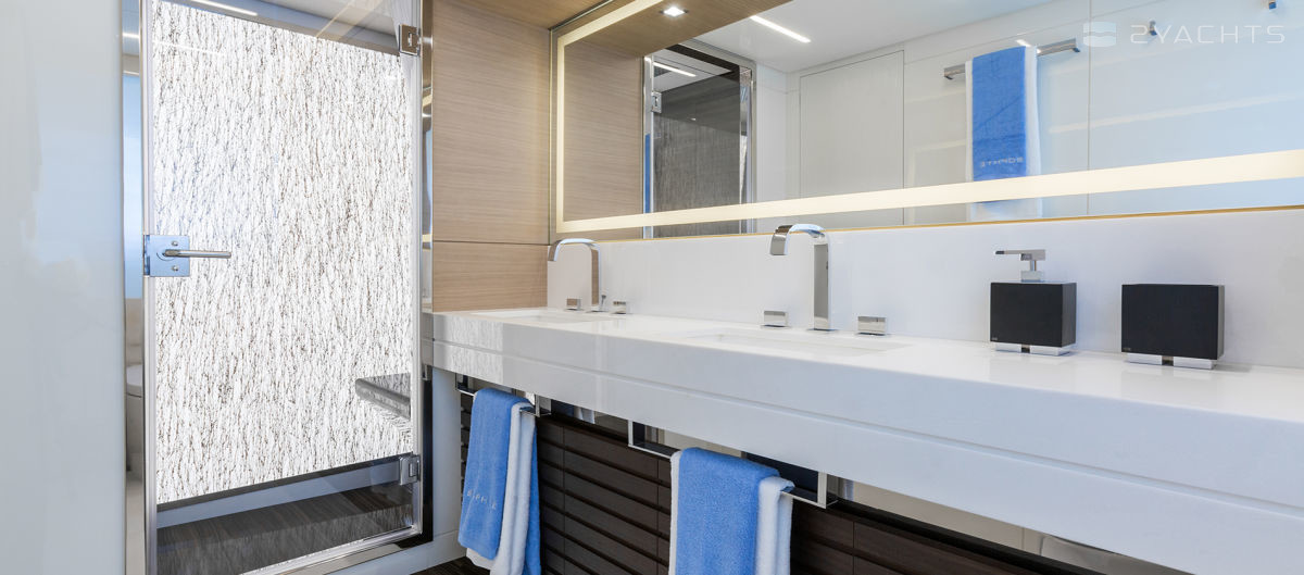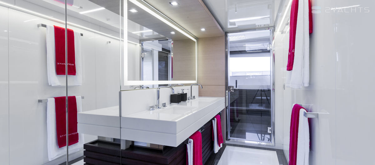 En el flybridge hay una zona de sofás y una cocina con barra de bar, un parque eólico y una parrilla de barbacoa. En la proa hay una sala de estar. Desde él, a través de una puerta transparente, hay un pasaje al salón con acristalamiento panorámico, donde hay un comedor con dos sofás y mesas. Por la noche, gracias a los LED, puede crear un efecto de cielo estrellado en la cabina. Hay un televisor de pantalla panorámica, cuya pantalla, cuando se utiliza el sistema Masterbolt, puede servir como sala de cine.