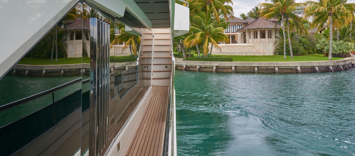 En la popa hay una cabina desde la que una escalera conduce a una plataforma de baño con tumbonas. Debajo hay un garaje, donde se encuentran simultáneamente una licitación y una moto de agua.