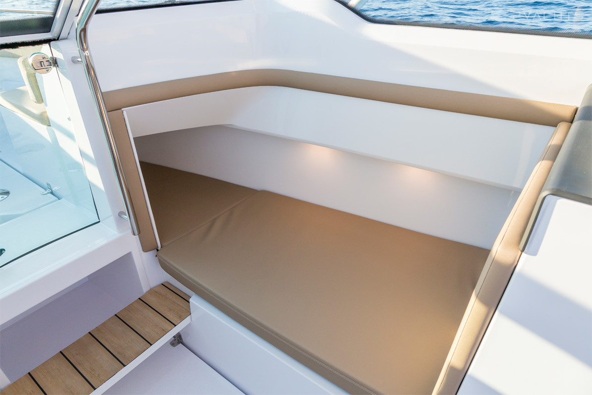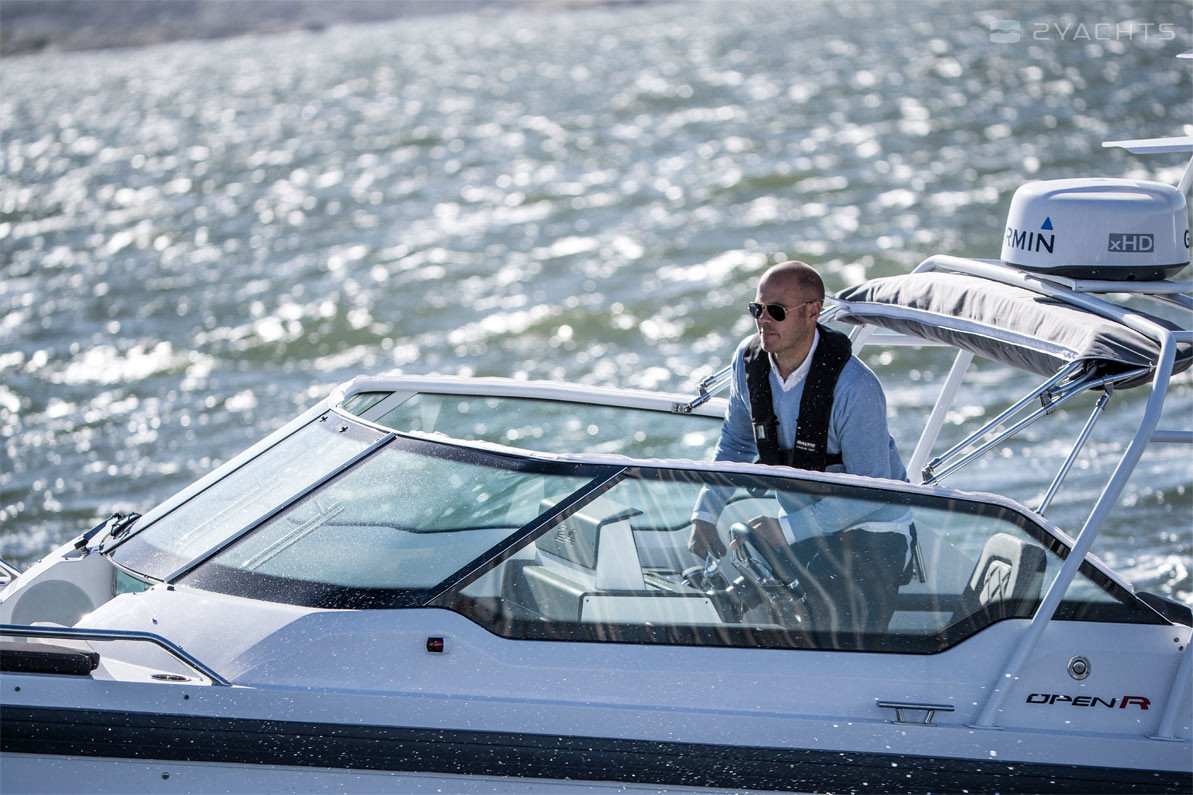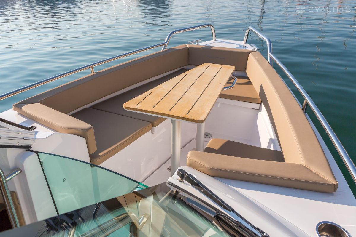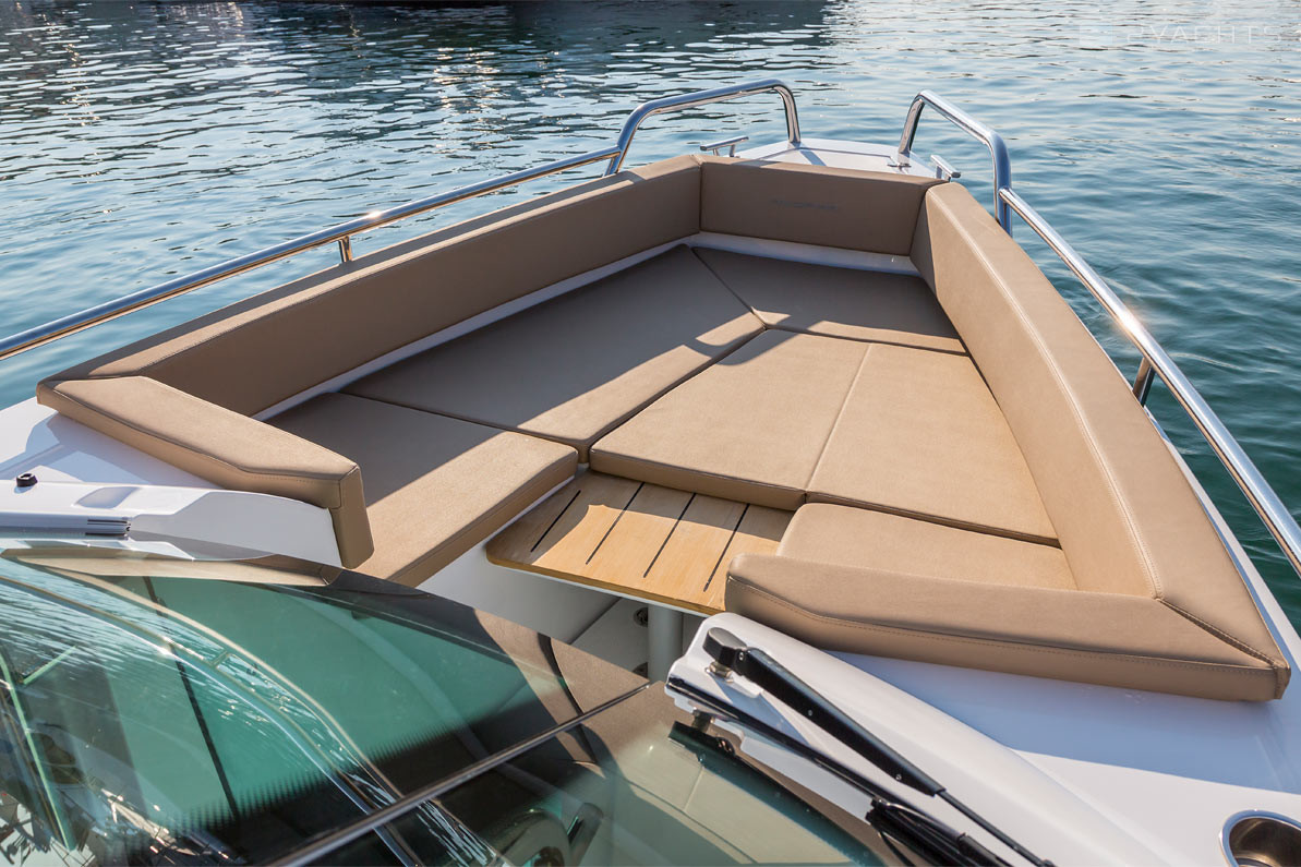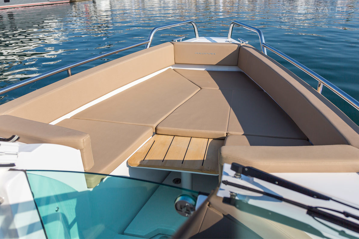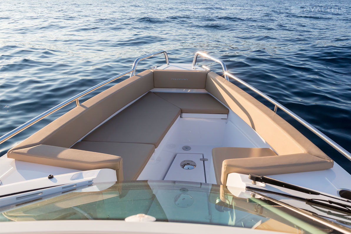 El parabrisas tiene un paso a través del cual puede ingresar a la plataforma de proa abierta Axopar 24 Open. Está equipado con un sofá esquinero tapizado con taquillas incorporadas y un accesorio para una mesa extraíble, que se incluye en el modelo estándar. En la popa del barco, hay dos plataformas para acceder al agua, una de las cuales está equipada con una escalera plegable, un aireador, pasamanos de metal y un soporte de remolque.