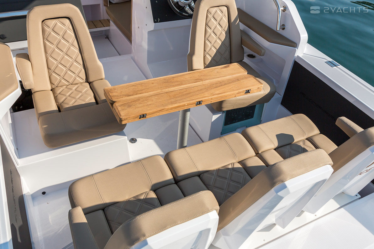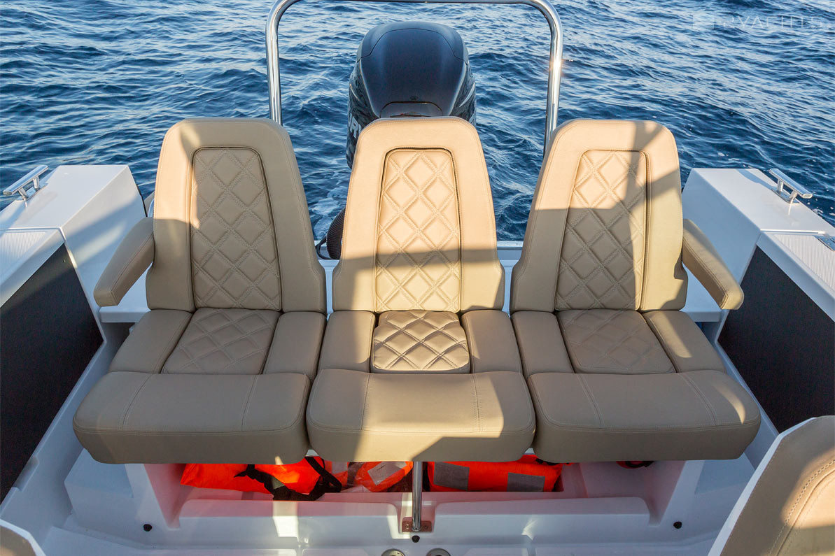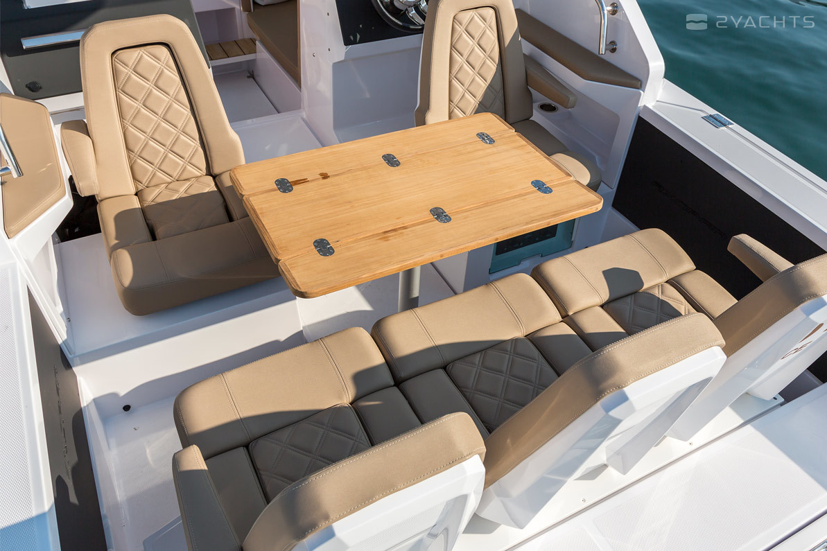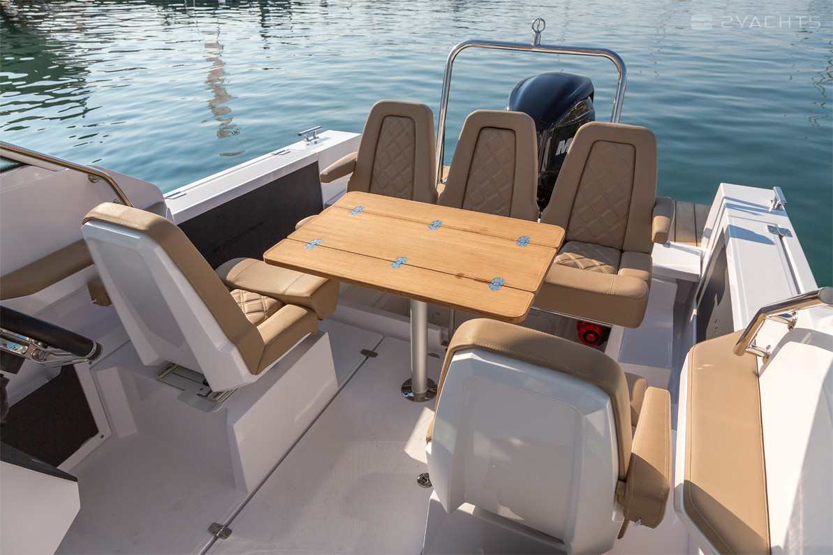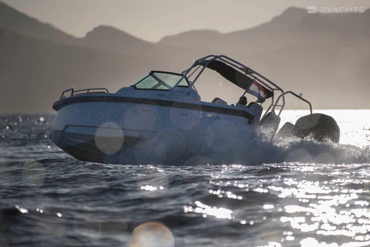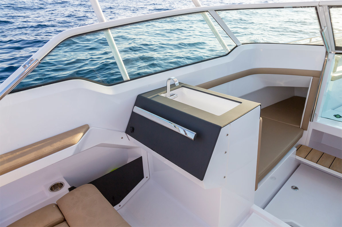 El parabrisas tiene un paso a través del cual puede ingresar a la plataforma de proa abierta Axopar 24 Open. Está equipado con un sofá esquinero tapizado con taquillas incorporadas y un accesorio para una mesa extraíble, que se incluye en el modelo estándar. En la popa del barco, hay dos plataformas para acceder al agua, una de las cuales está equipada con una escalera plegable, un aireador, pasamanos de metal y un soporte de remolque.