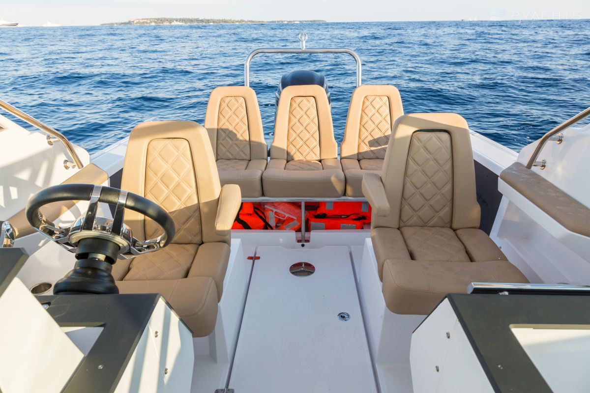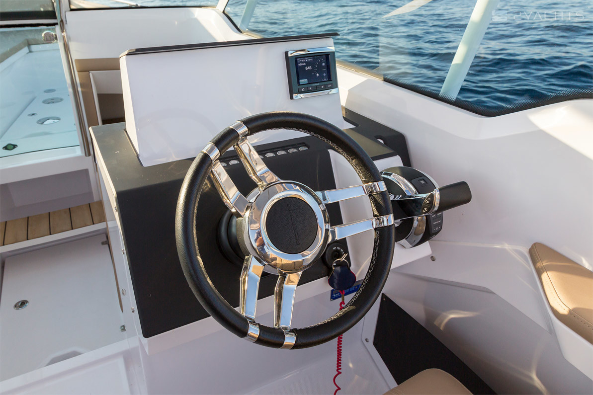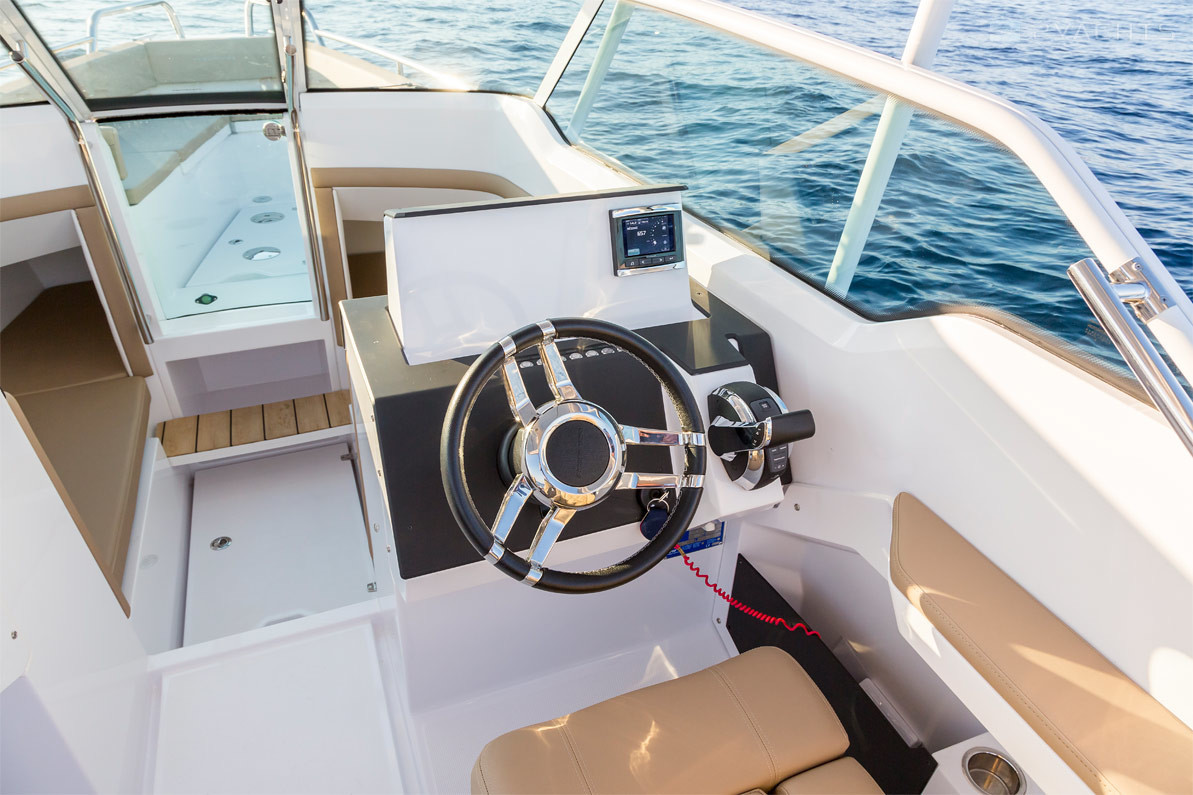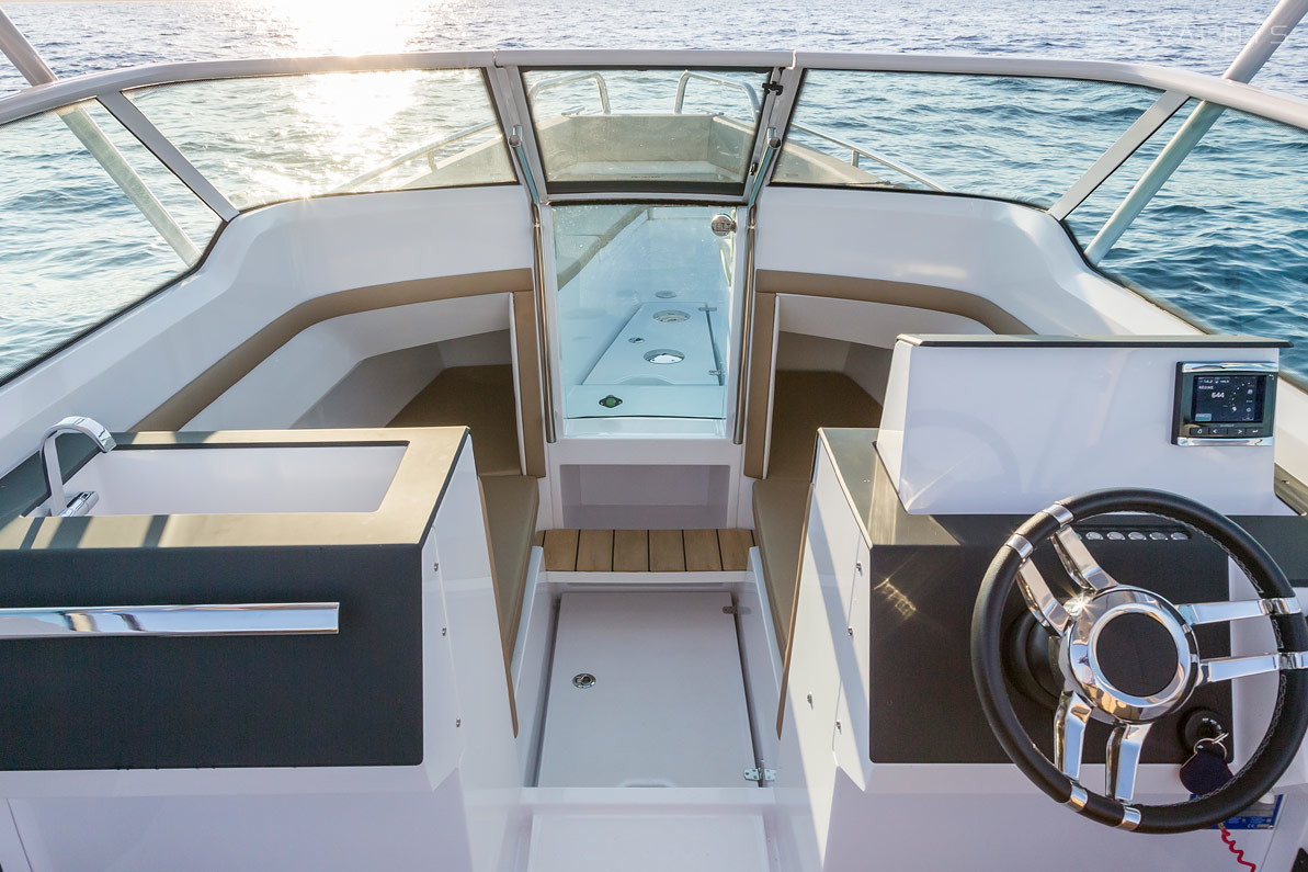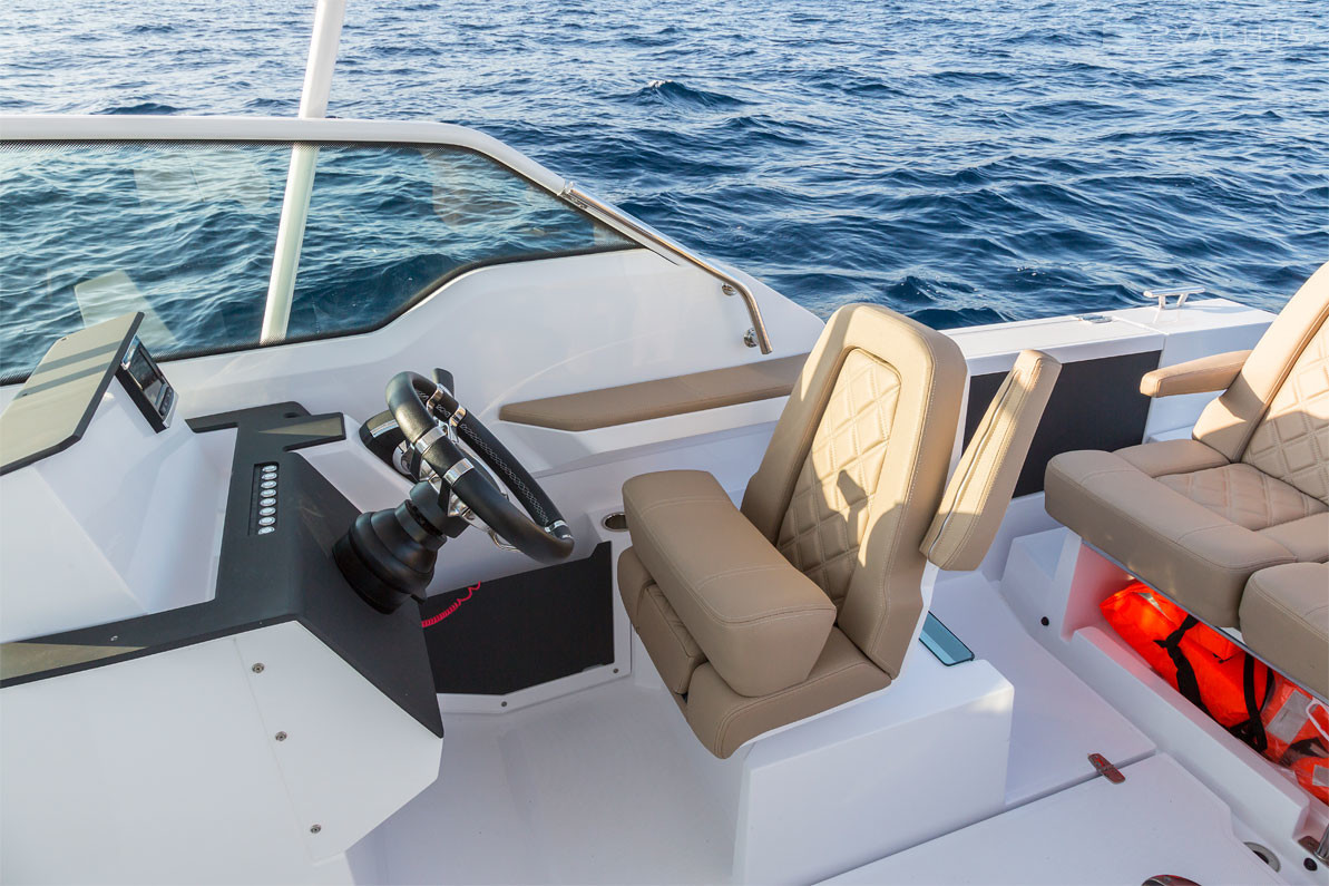 La estación del capitán del barco se encuentra en el lado de estribor de la cabina y está equipada con un volante ajustable, pantalla electrónica y una caja compacta. En el babor hay una cocina extraíble con fregadero, parrilla y varios cajones para comida. Enfrente hay dos sillones giratorios suaves y un sofá para varias personas, entre los cuales se encuentra una mesa de comedor de madera. Hay un arco de metal sobre la cabina y pasamanos a los lados. A la izquierda del panel de control se encuentra la entrada a una cabina compacta, equipada con dos sofás que se pueden convertir en una cama doble y un baño extraíble.