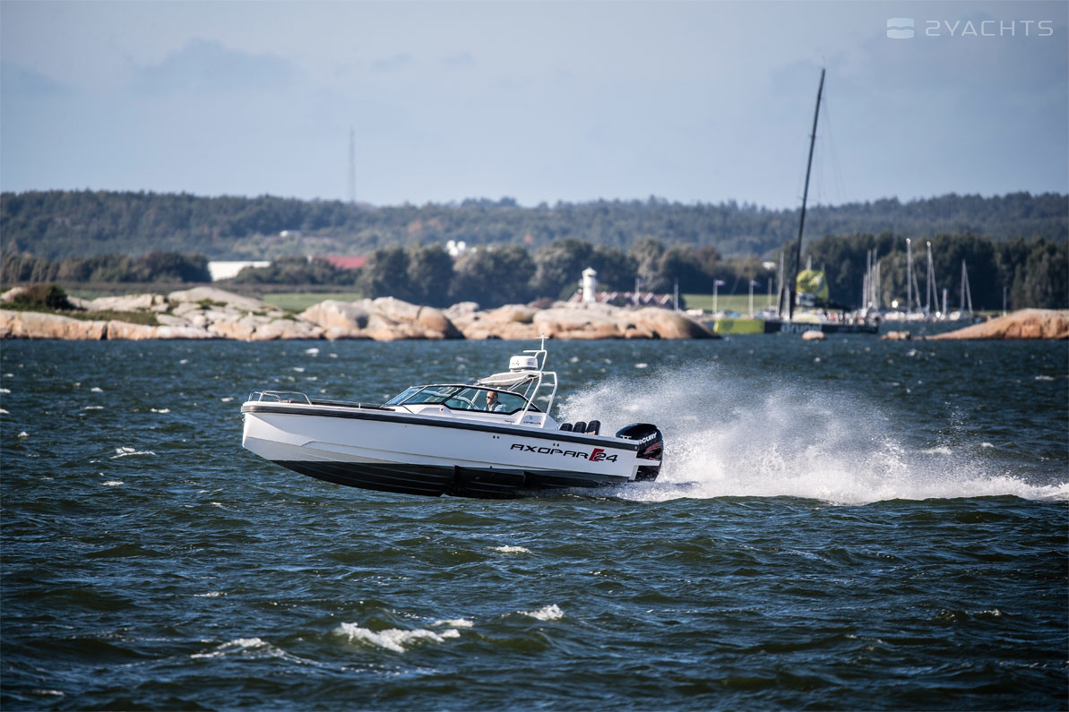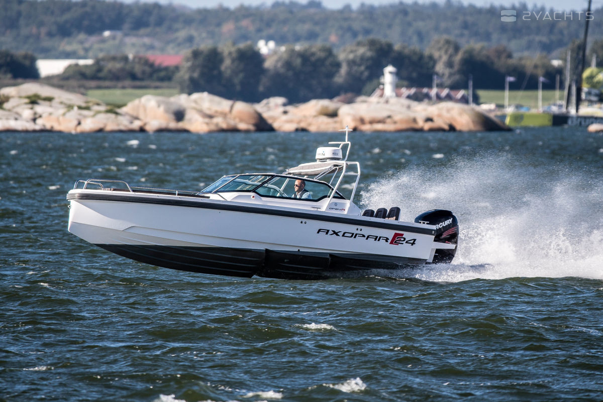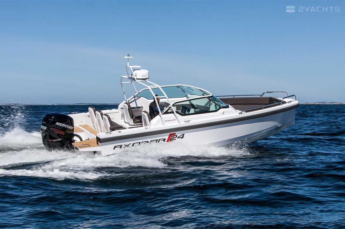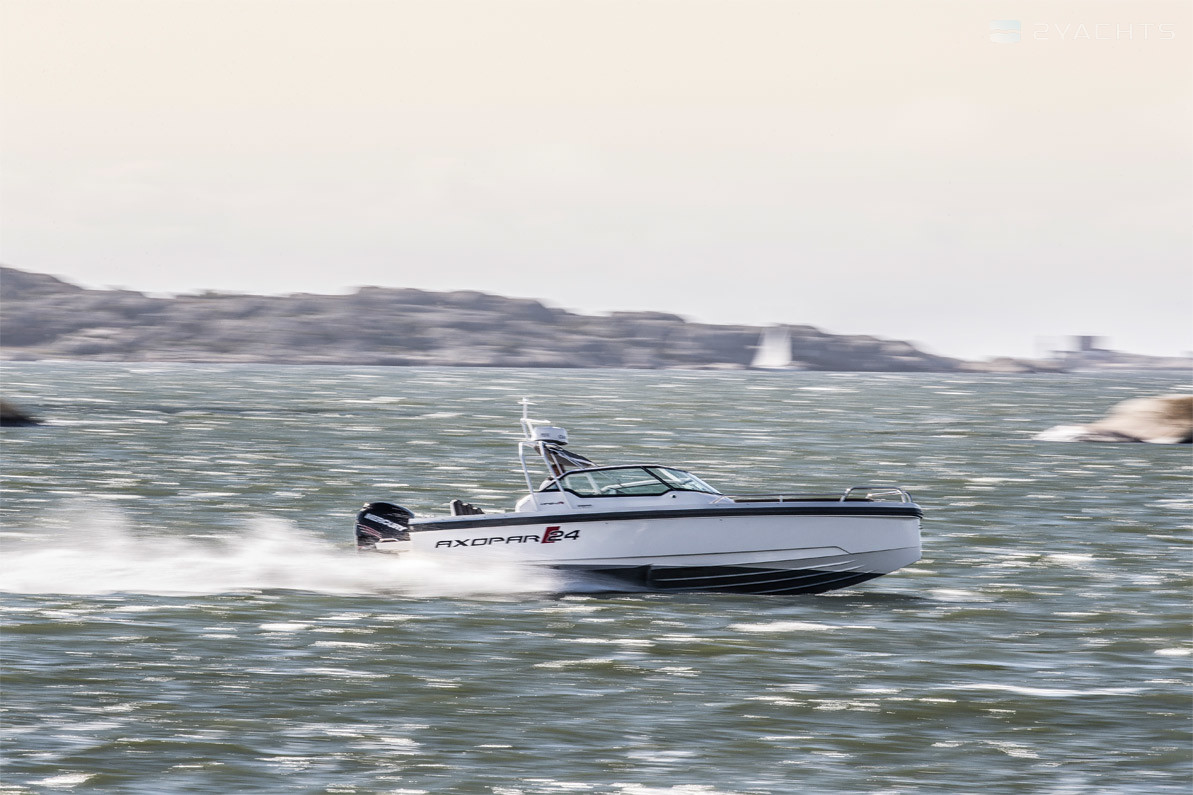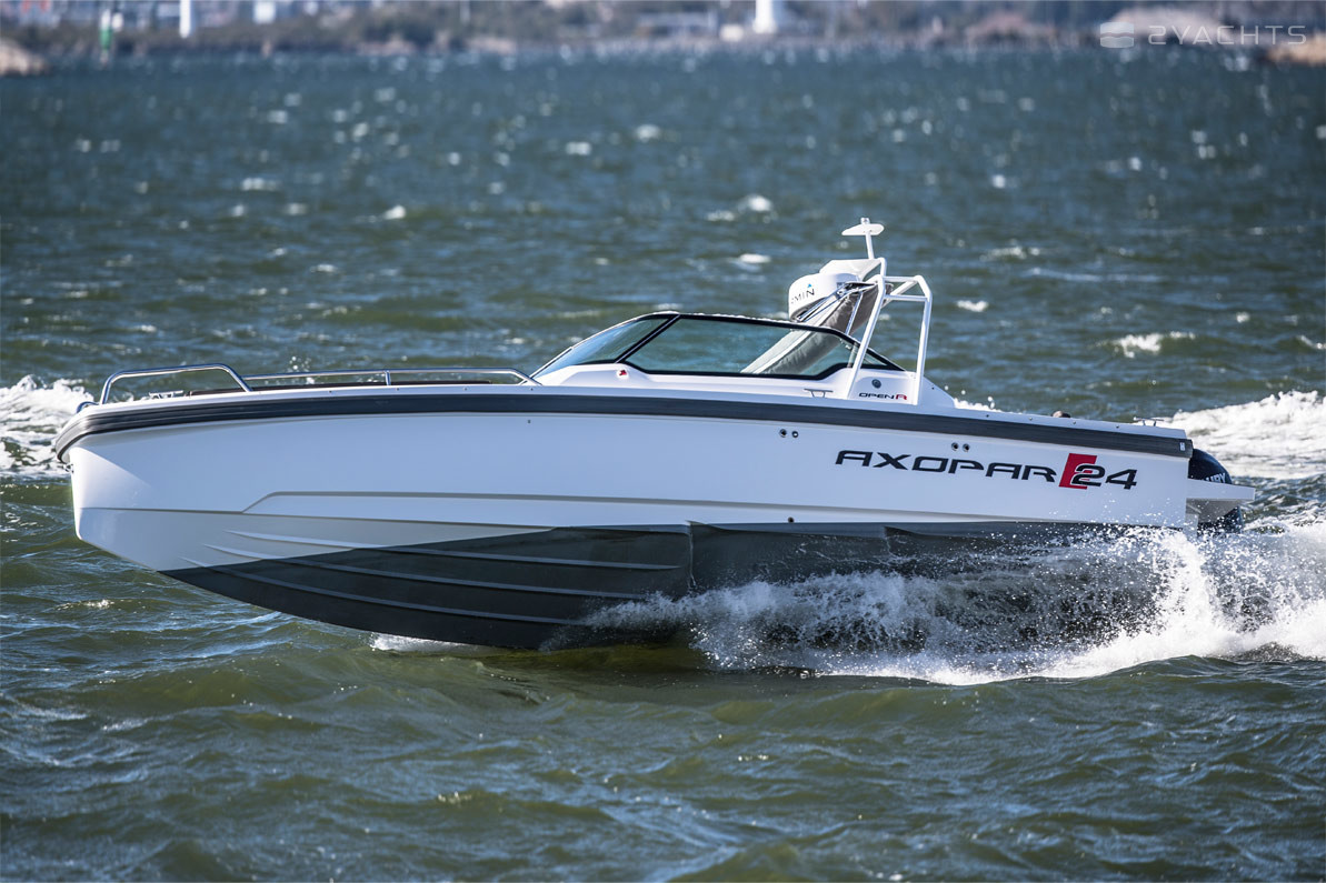 El barco de recreo Axopar 24 Open se fabrica desde 2017. Tiene un casco de fibra de vidrio, cuya longitud es de 7.6 metros, ancho - 2.55 metros y calado - 0.7 metros. El barco tiene ocho asientos y dos literas para pasajeros. La presencia de la certificación internacional CE (C) permite salidas solo dentro de las aguas costeras.