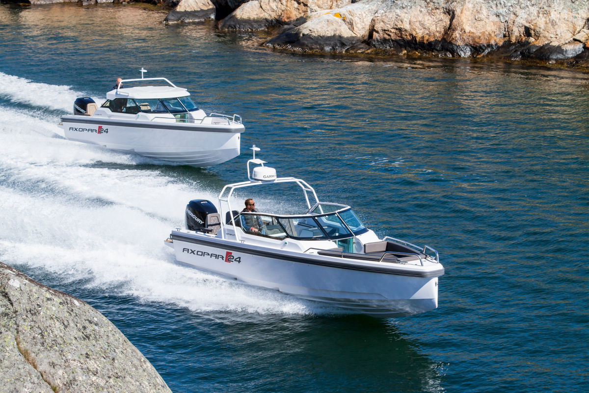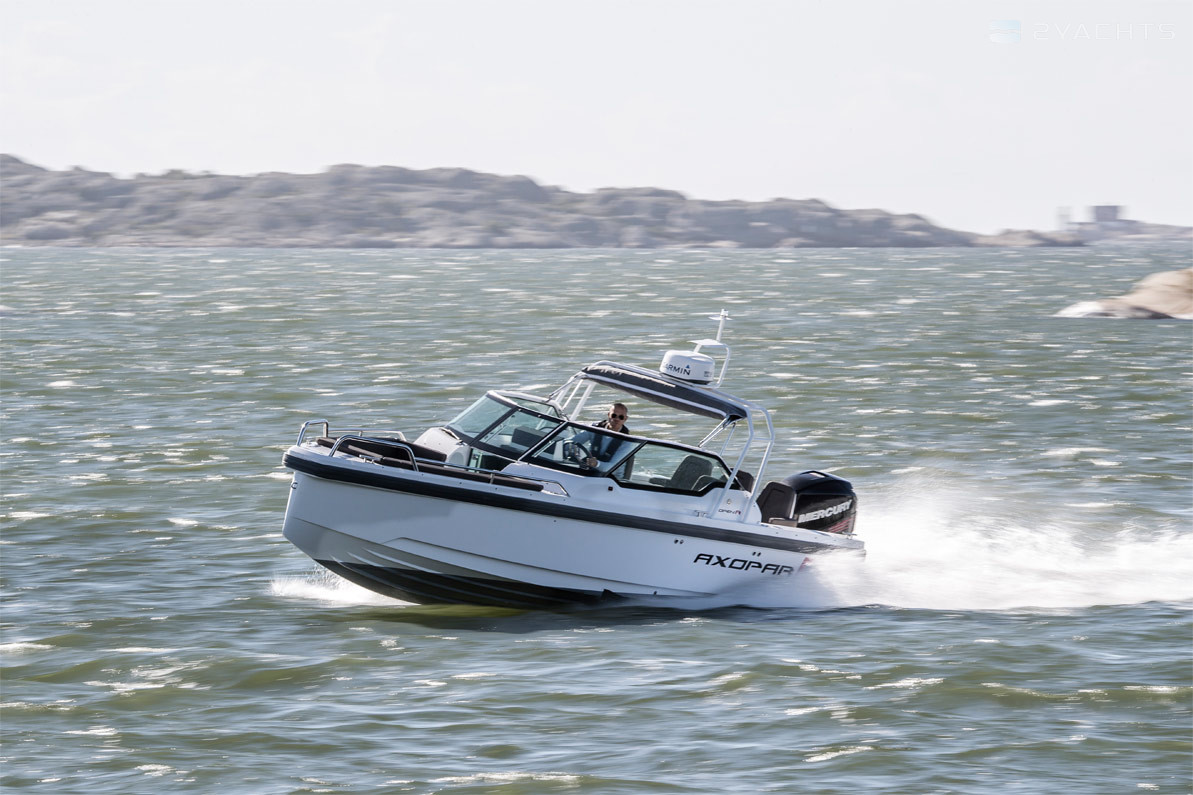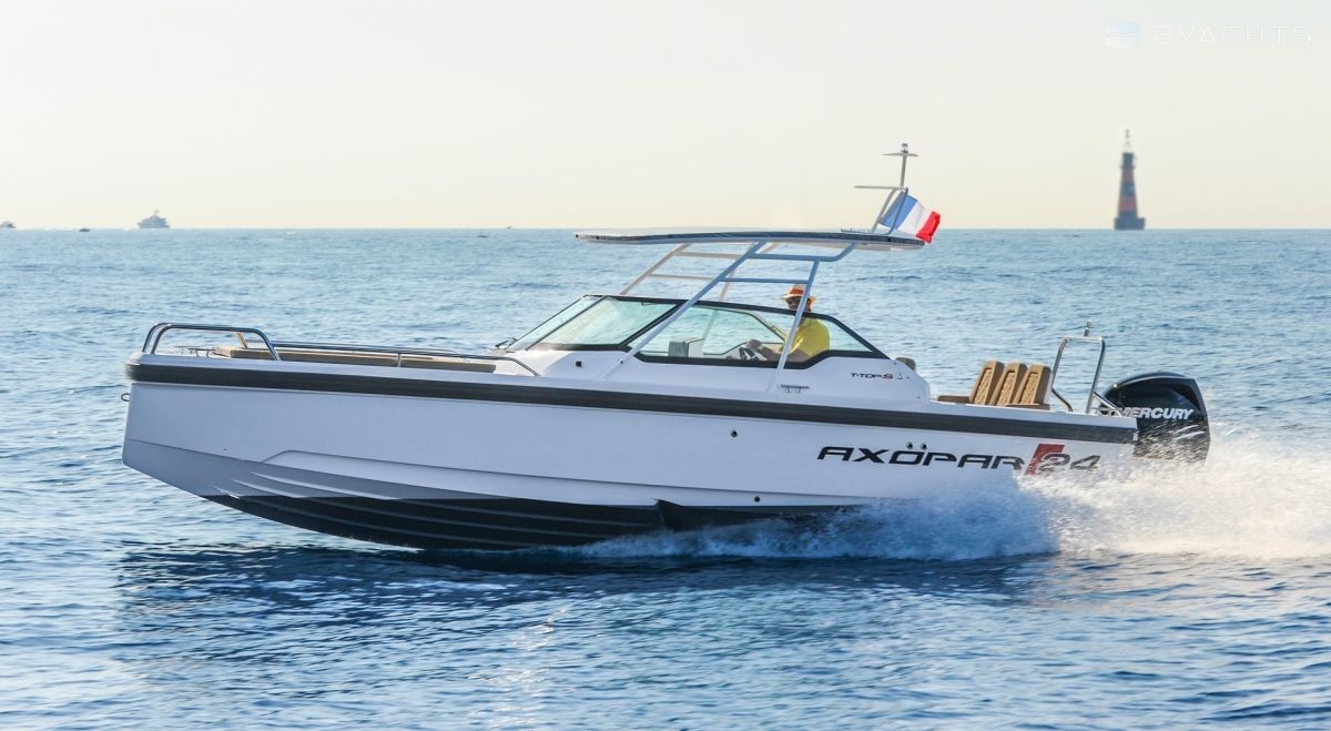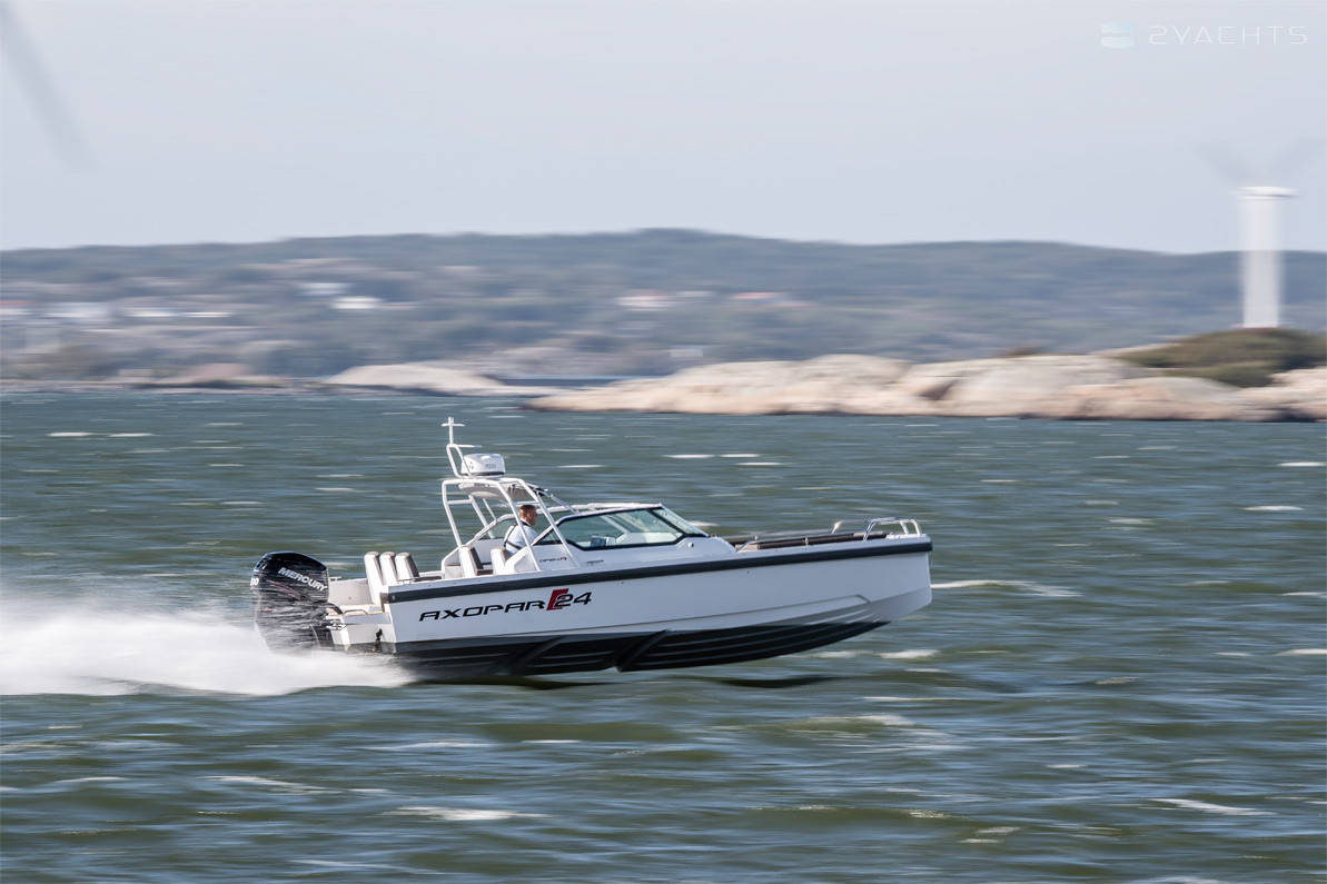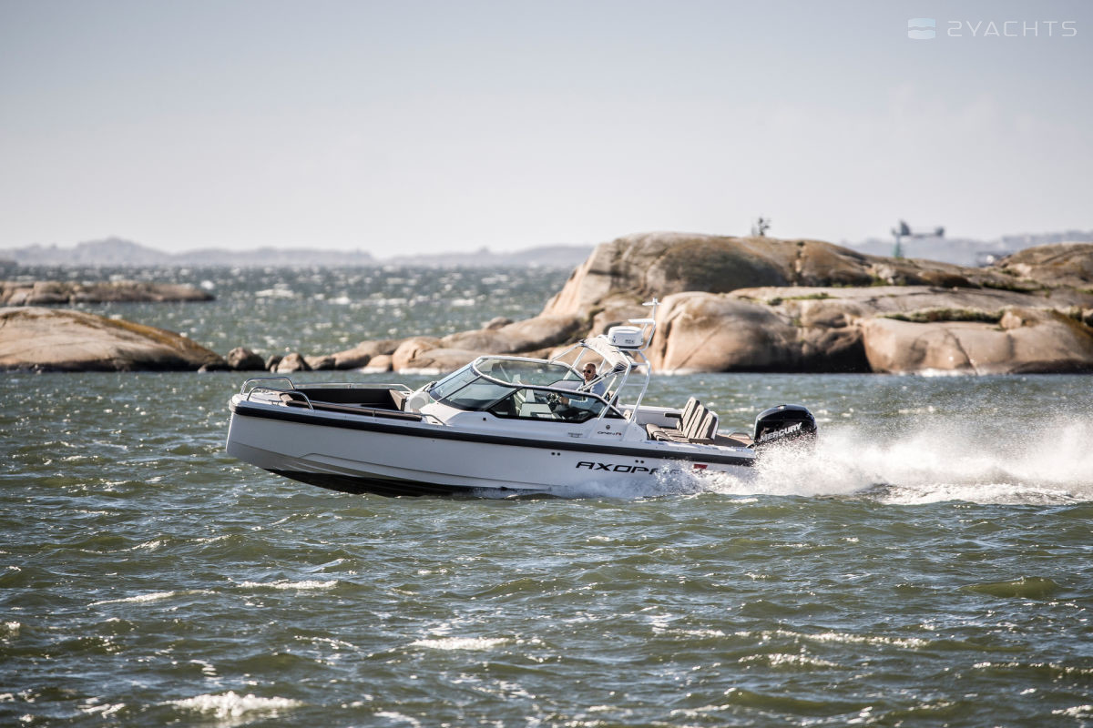 El barco de recreo Axopar 24 Open se fabrica desde 2017. Tiene un casco de fibra de vidrio, cuya longitud es de 7.6 metros, ancho - 2.55 metros y calado - 0.7 metros. El barco tiene ocho asientos y dos literas para pasajeros. La presencia de la certificación internacional CE (C) permite salidas solo dentro de las aguas costeras.