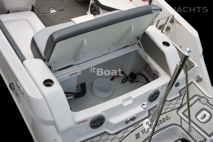 El tablero tiene un velocímetro, tacómetro, medidor de presión de aceite y combustible. Todos los datos sobre el estado del bowrider se muestran en la pantalla digital: velocidad y número de revoluciones. Los rieles y las calas del recipiente están hechos de acero inoxidable. El barco tiene un sistema estéreo con cuatro altavoces a prueba de humedad. El volante del barco es regulable en altura y la silla del capitán con reposapiés y portavasos.