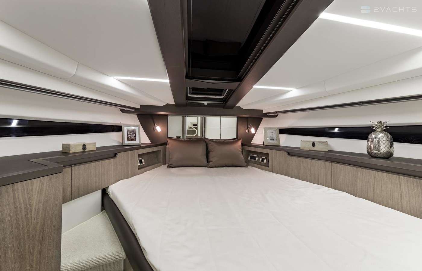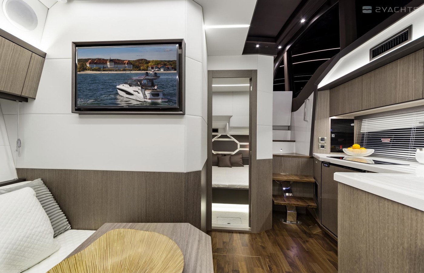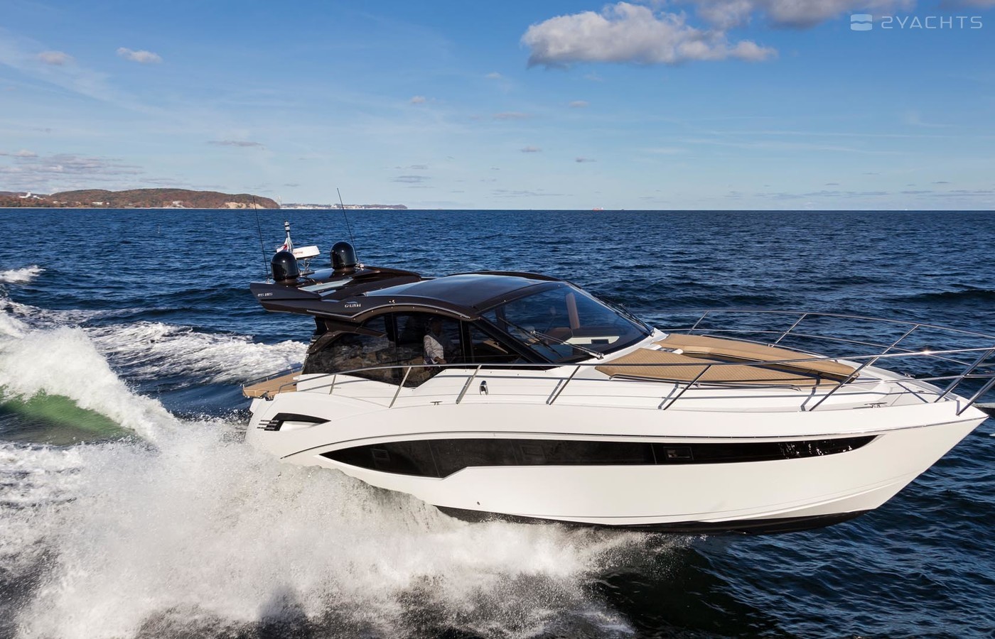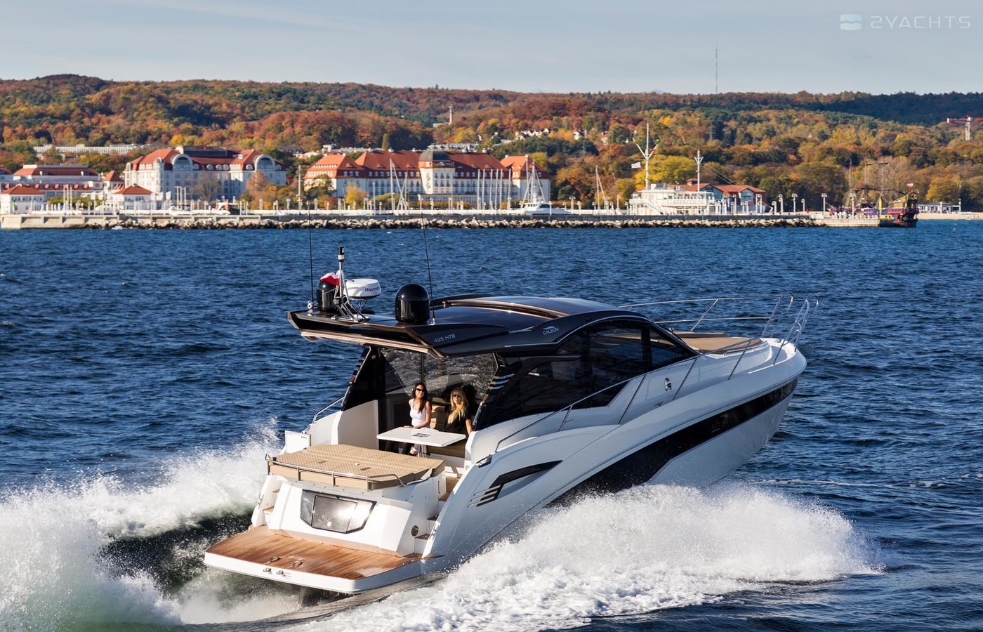 El yate a motor Galeon 425 HTS ha estado en producción desde 2019 por la misma compañía. La cubierta principal del barco está equipada con ventanas panorámicas, logrando así un buen nivel de iluminación durante el día. El yate tiene un techo de vidrio y una puerta que protege el espacio del agua y el exceso de ruido. El yate está diseñado con dos dormitorios y un salón debajo de la cubierta, y la cabina principal se encuentra en la parte central sobre toda el área de la embarcación.