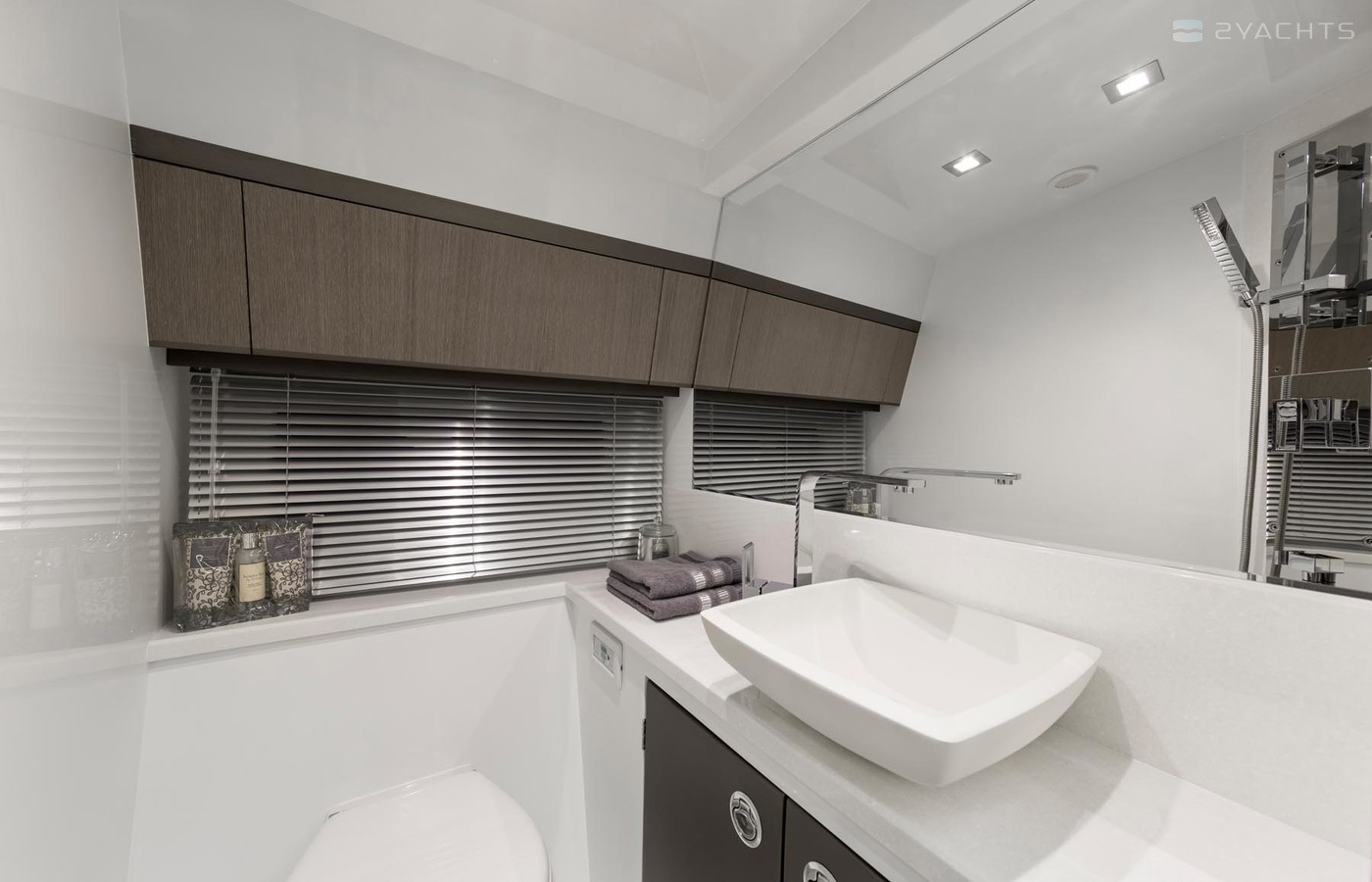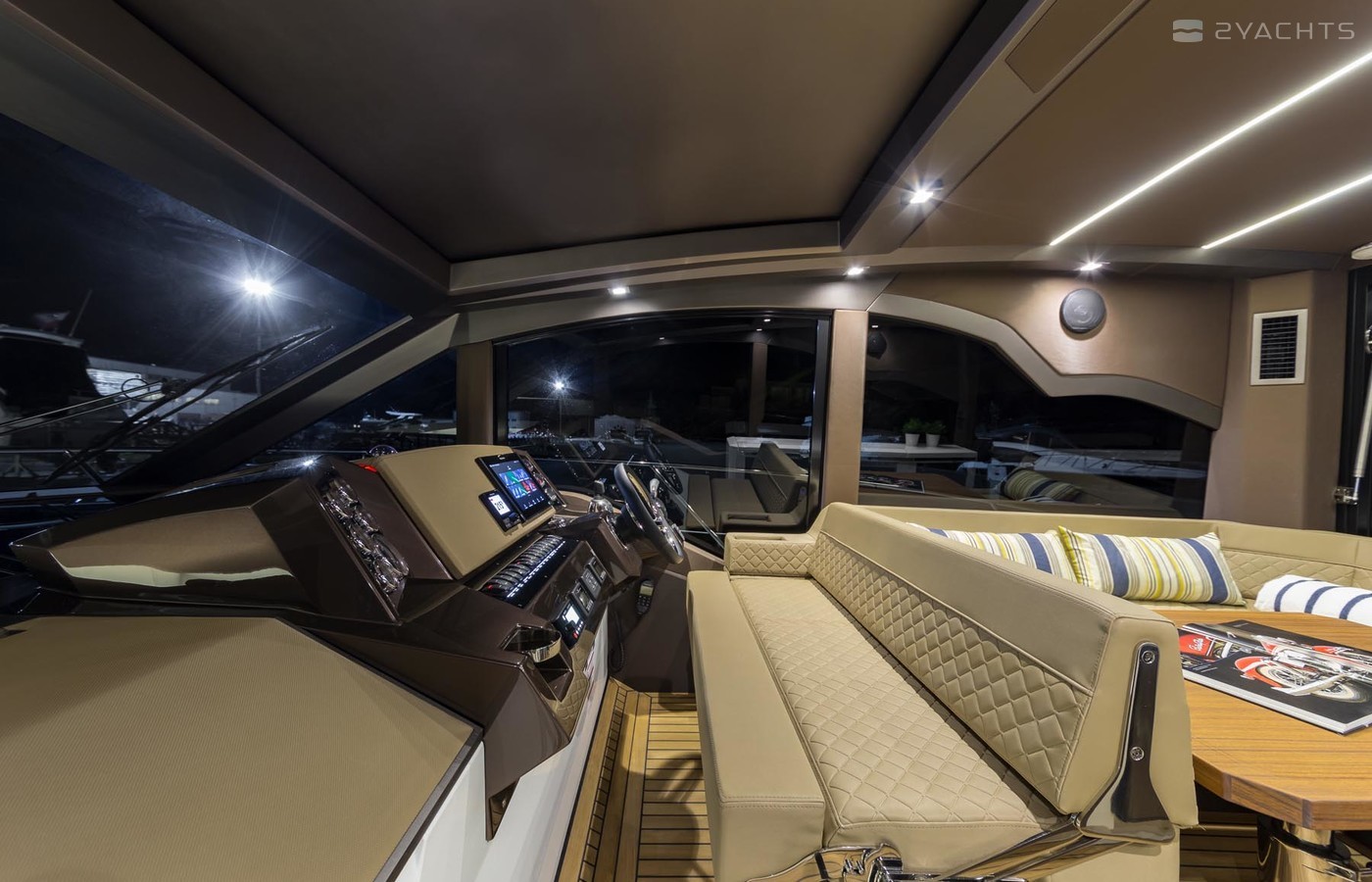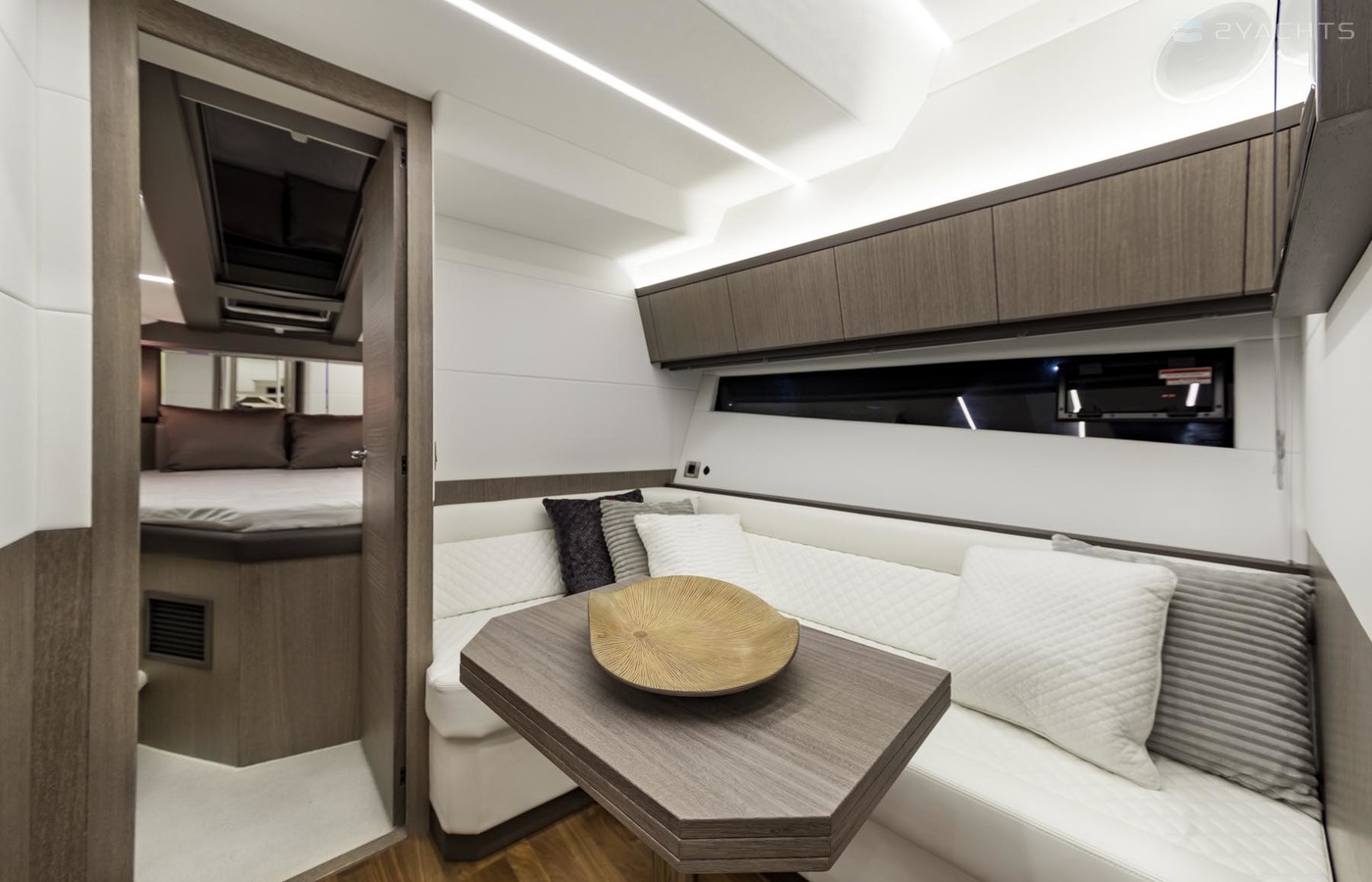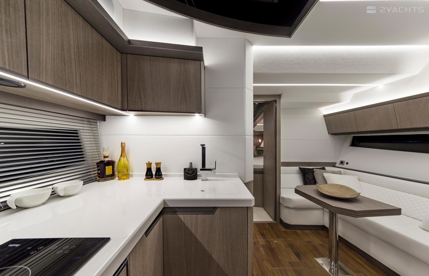 El yate a motor Galeon 425 HTS ha estado en producción desde 2019 por la misma compañía. La cubierta principal del barco está equipada con ventanas panorámicas, logrando así un buen nivel de iluminación durante el día. El yate tiene un techo de vidrio y una puerta que protege el espacio del agua y el exceso de ruido. El yate está diseñado con dos dormitorios y un salón debajo de la cubierta, y la cabina principal se encuentra en la parte central sobre toda el área de la embarcación.