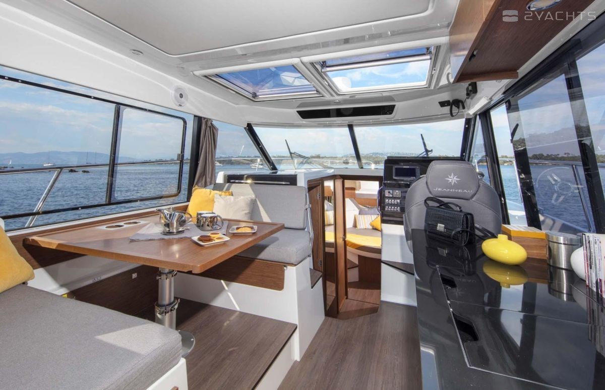 Al lado del puesto del capitán, hay una puerta que conduce a las cabañas, que están equipadas con camas dobles, armarios y cajones para sus pertenencias personales. Hay un baño en una habitación separada en el babor. Fuera de la cabina de Jeanneau Merry Fisher 1095 hay un sofá de esquina suave con una mesa extraíble. En el lado de estribor hay un pasaje que conduce a la proa del barco, equipado con dos tumbonas.