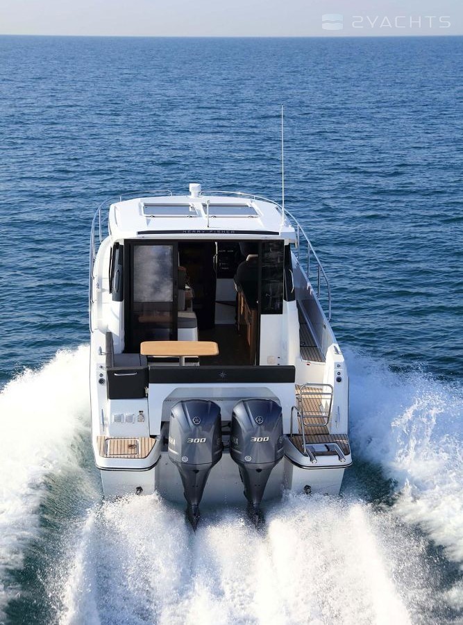 En la popa del bote, hay dos plataformas con una escalera para acceder al agua y un accesorio de remolque. El modelo está equipado con dos motores fuera de borda de 300 hp. Su tanque de combustible tiene capacidad para 800 litros y el tanque de agua dulce tiene capacidad para 160 litros.