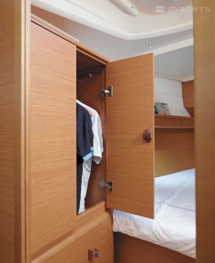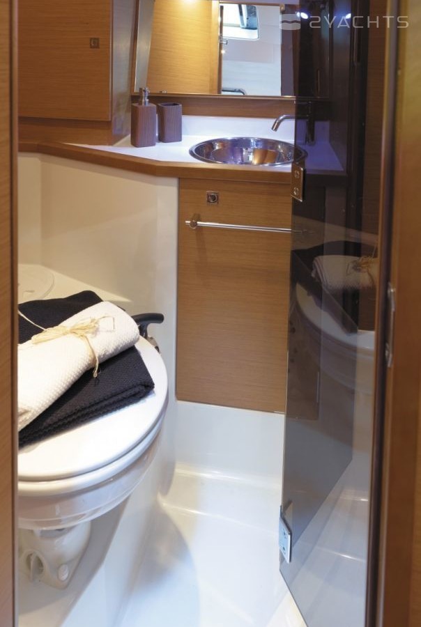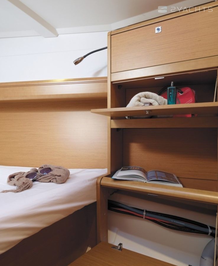 En la cabina del barco hay dos sofás que se pueden transformar en tumbonas y armarios. Entre ellos hay una mesa plegable, en la que se proporciona un pasaje al puesto del capitán con dos sillas y un volante ajustable. La popa de la embarcación está equipada con una plataforma con una escalera plegable para acceder al agua, y se instalan barandas metálicas a los lados. Puede ingresar a las cabañas Jeanneau Sun Odyssey 389 a través de una puerta ubicada entre los sofás de la cabina.