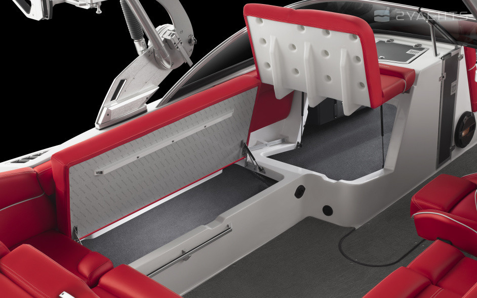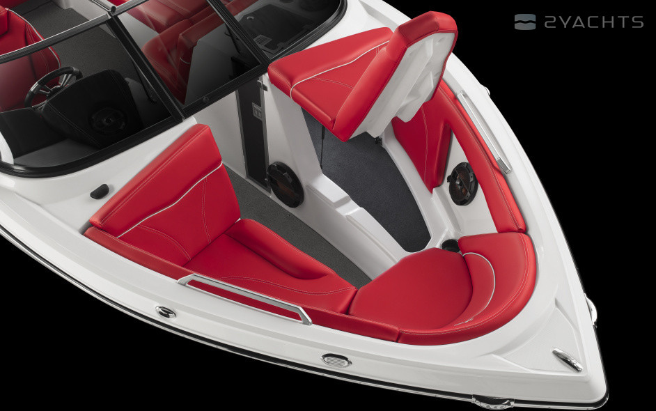 En el lado izquierdo de la cabina hay un compartimento frigorífico con varios portavasos, y detrás hay un sofá de esquina suave equipado con varios armarios, así como un arco de metal con accesorios para tablas de wakeboard y un toldo plegable incluido en el modelo estándar del modelo. Más adelante a lo largo de la cabina hay una espaciosa y suave tumbona equipada con un aireador y dos armarios. A popa es una plataforma compacta con una escalera extraíble para acceder al agua y una barra de remolque.