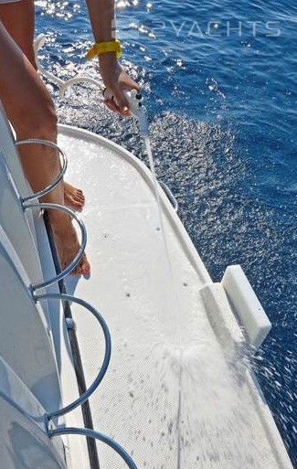 La cocina está equipada con fregadero, grifo, microondas, cocina a gas, refrigerador y armarios para guardar los platos. La cabina tiene dos literas, una mesa de comedor y una escotilla que conduce a la cubierta superior.