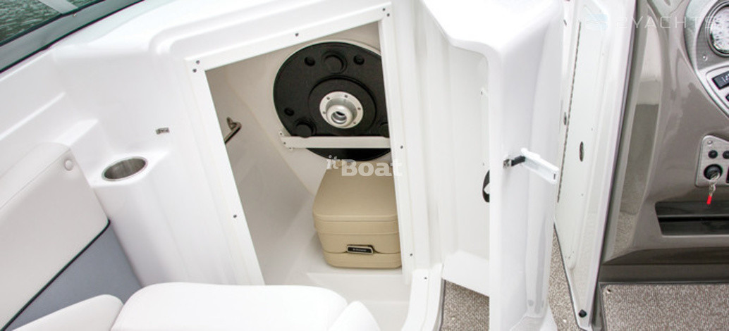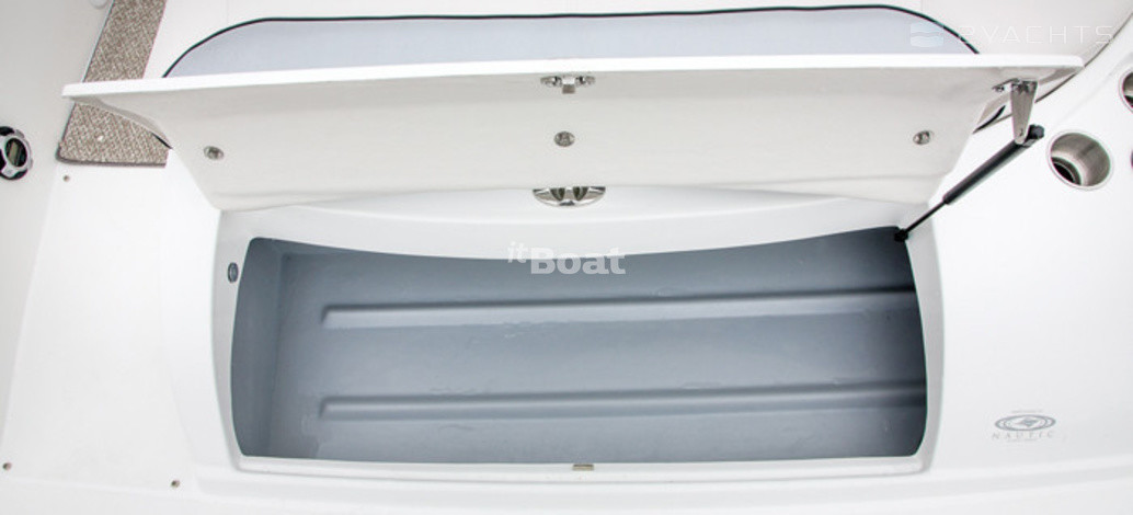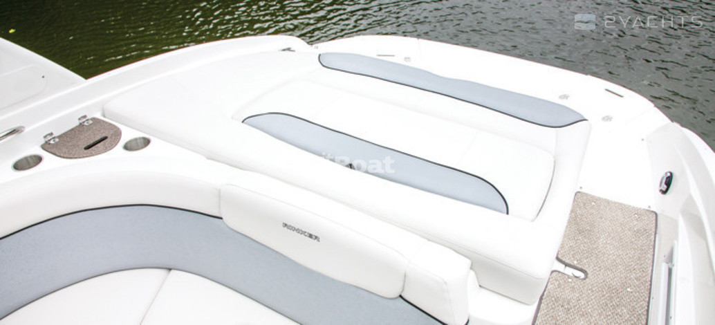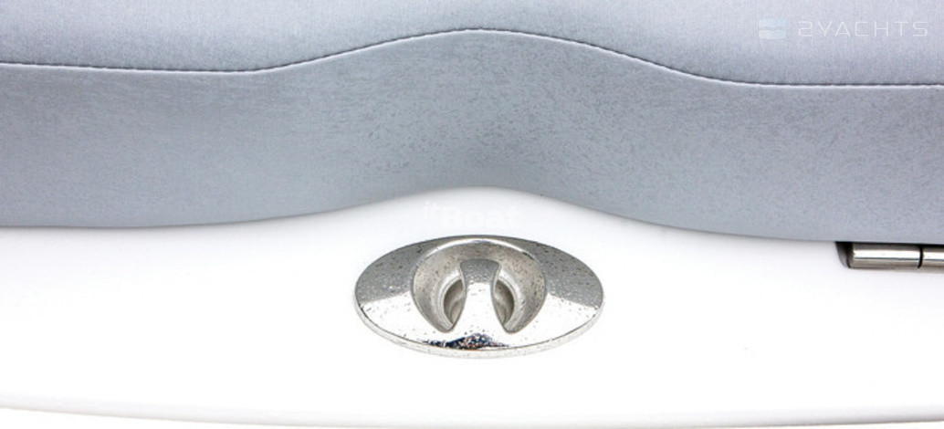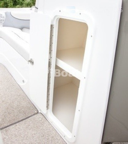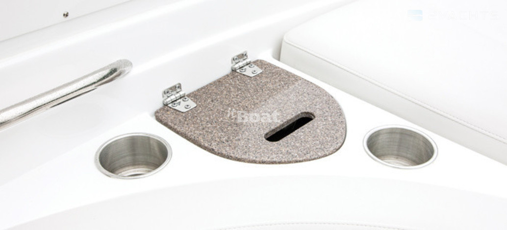 En la proa de este jinete de proa, se forma un área de recreación con dos tumbonas laterales. Entre ellos, en el pasillo de la nariz, se puede instalar una mesa plegable para formar una zona de cóctel. La cabina del barco está abierta, acristalada al frente. Detrás del panel de instrumentos, ubicado en el lado derecho del tablero, hay una silla giratoria del capitán. A la izquierda, se instala el mismo asiento para el pasajero, y detrás del asiento del capitán hay una barra montada a bordo con un armario para guardar los platos. En la cabina hay un sofá semicircular para tres pasajeros, e inmediatamente detrás hay un compartimento para un cubo de basura. Desde la cabina hasta la plataforma de baño con ducha, puedes caminar por el piso de madera en el babor.