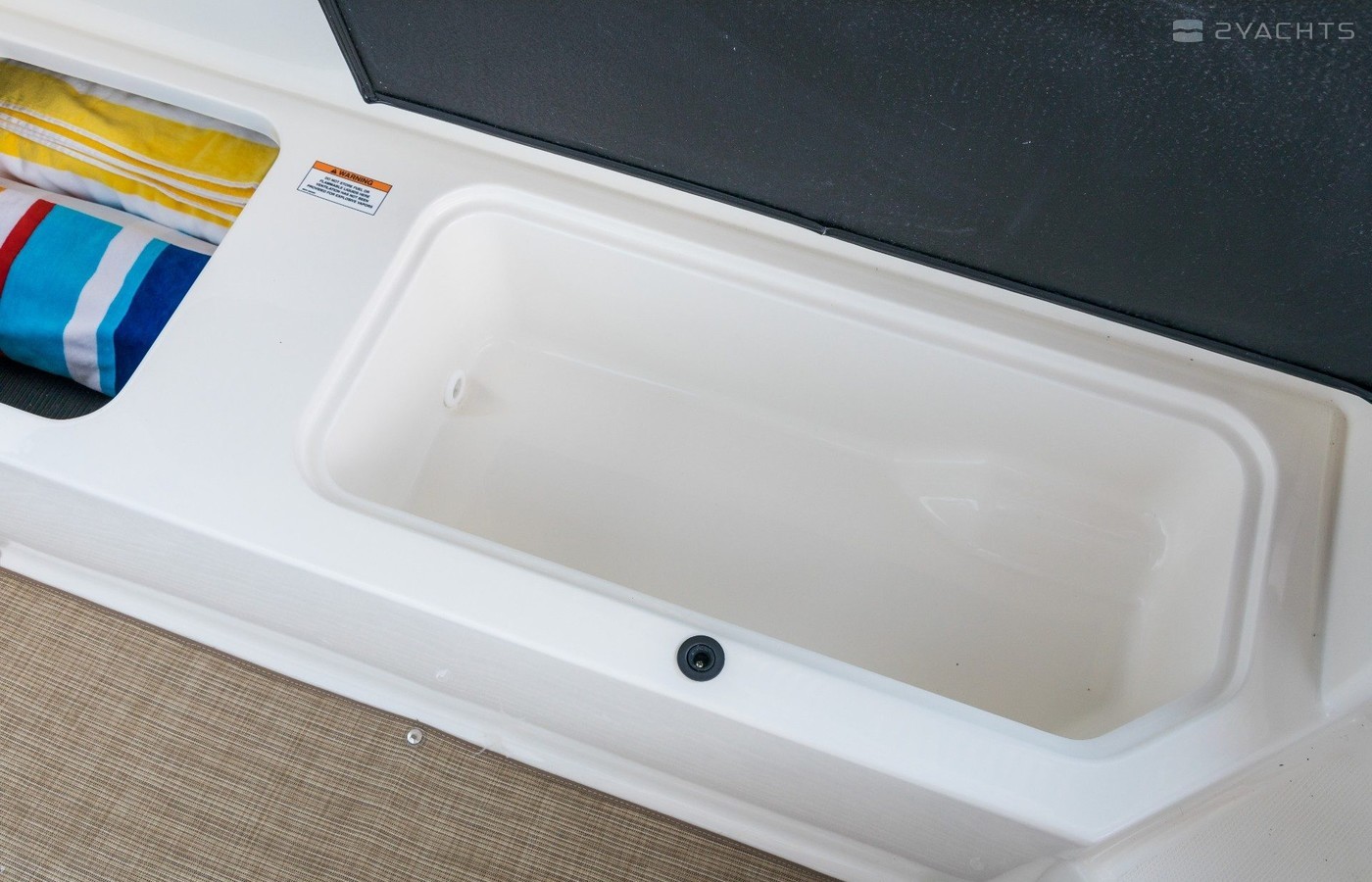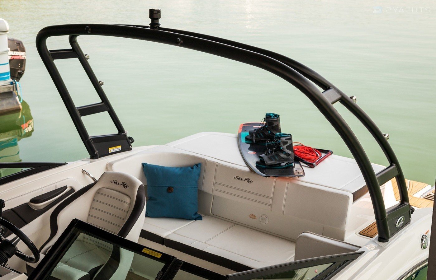 Se utiliza acero inoxidable en el interior de la embarcación: las asas, los portavasos y otros elementos decorativos están hechos de él. El modelo está equipado con un sistema automático de extinción de incendios, medidor de profundidad, luces de navegación, toma de corriente de 12 V y una plataforma de baño con escalera. A bordo hay varios compartimentos para almacenar objetos personales, incluso debajo de los sillones y en el piso. El capitán tiene una cómoda silla giratoria; los pasajeros tienen un sofá con almohadas extraíbles. El barco también está equipado con un sistema estéreo AM / FM Fusion® con capacidad de sincronización Bluetooth y Wi-Fi.