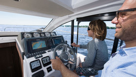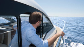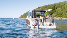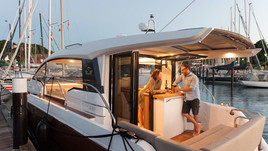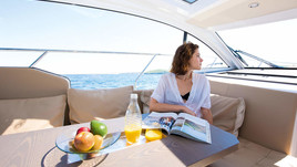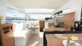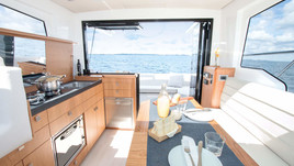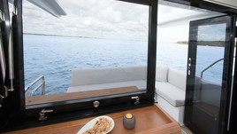 En la cubierta principal en su proa hay una zona de estar con tumbonas. En el interior con techo rígido, es posible ajustar la luz natural debido a la máxima versatilidad de las secciones de techo que se abren. Para el timonel, se proporciona un fácil acceso a la proa del barco desde la estación del timón debido a la puerta deslizante en el lado de estribor. Las mismas puertas y una ventana con bisagras se encuentran en la parte de popa del salón, lo que hace posible combinar su espacio con la cabina.