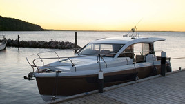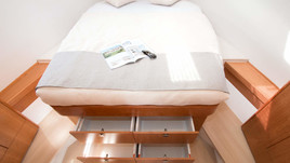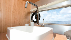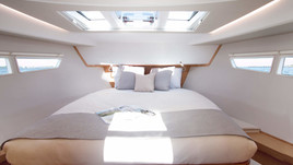 Desde el salón a través de las puertas correderas hay un pasaje a la cabina con un sofá de popa y un aparador instalados. Desde la cabina, una escalera conduce a una plataforma de baño con una pasarela retráctil.