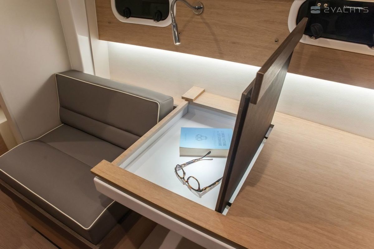 À l'intérieur du cockpit, il y a une cuisine avec un évier, un four électrique et un four, un évier, ainsi que plusieurs boîtes pour la nourriture et la vaisselle. À l'extérieur, il y a un canapé d'angle moelleux, une table à manger en bois, plusieurs chaises et un fauteuil compact. À la poupe, il y a deux plates-formes d'accès à l'eau avec des mains courantes en métal et une échelle pliante, un aérateur et une barre de remorquage. Les cabines du modèle sont équipées de lits doubles, d'armoires, de casiers spacieux, ainsi que de salles de bains avec douches dans des pièces séparées.