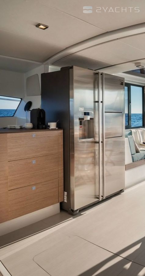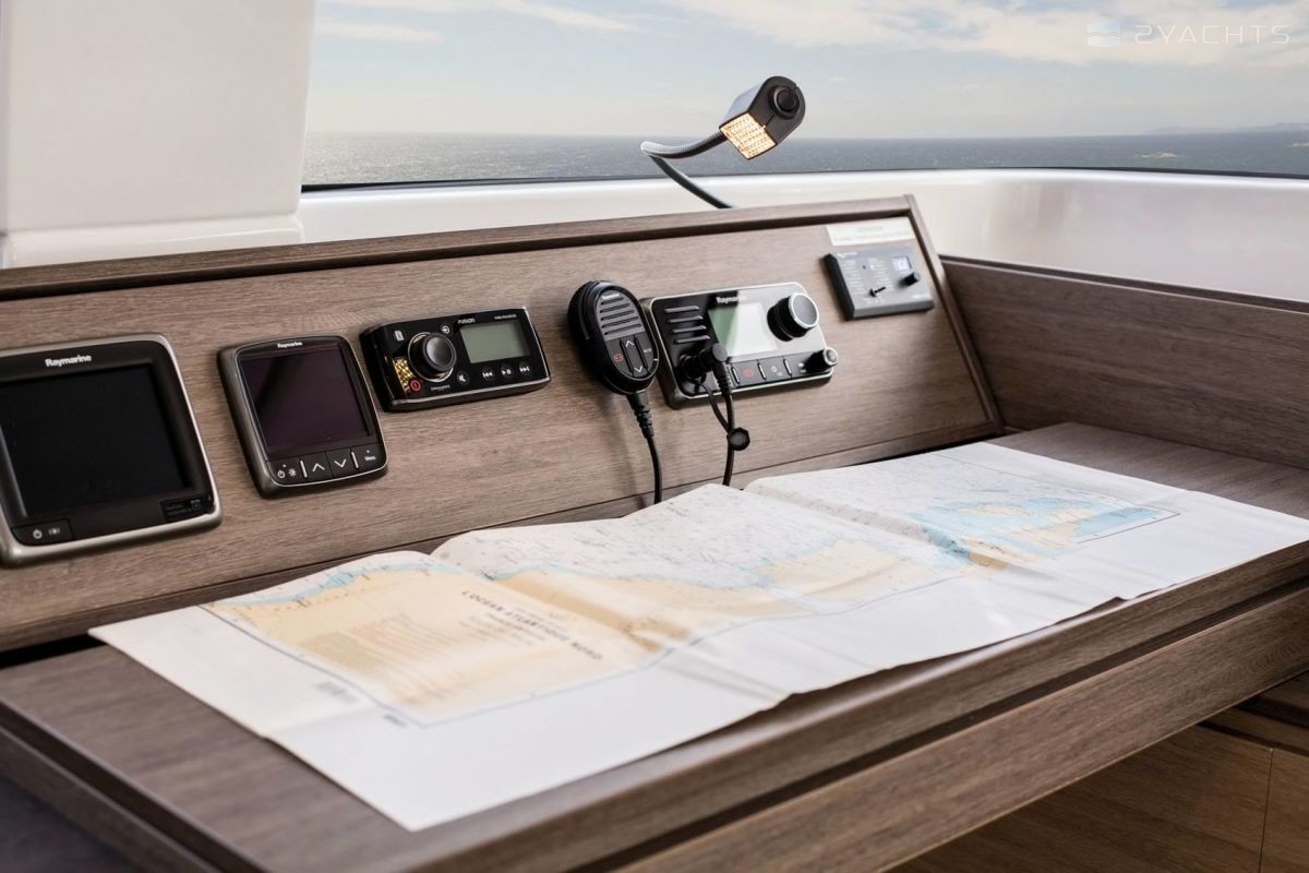 Sur la plate-forme ouverte avant du catamaran, il y a un canapé d'angle pour plusieurs personnes et une grande chaise longue. Pour y entrer, il y a des passerelles clôturées avec des balustrades métalliques sur les côtés. Le cockpit a un cockpit fermé avec un toit rigide, où il y a un poste de capitaine avec un volant réglable et une chaise pivotante, ainsi qu'un canapé d'angle avec une table compacte et une chaise longue spacieuse pour plusieurs personnes.