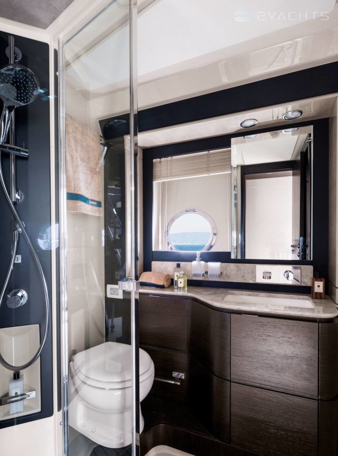 Azimut 66 est certifié pour fonctionner à moins de 200 milles marins du littoral. La puissance de deux moteurs à 1150 ch vous permet d'atteindre des vitesses allant jusqu'à 32 nœuds, et une alimentation en carburant de 3900 litres, de l'eau - 1000 litres.