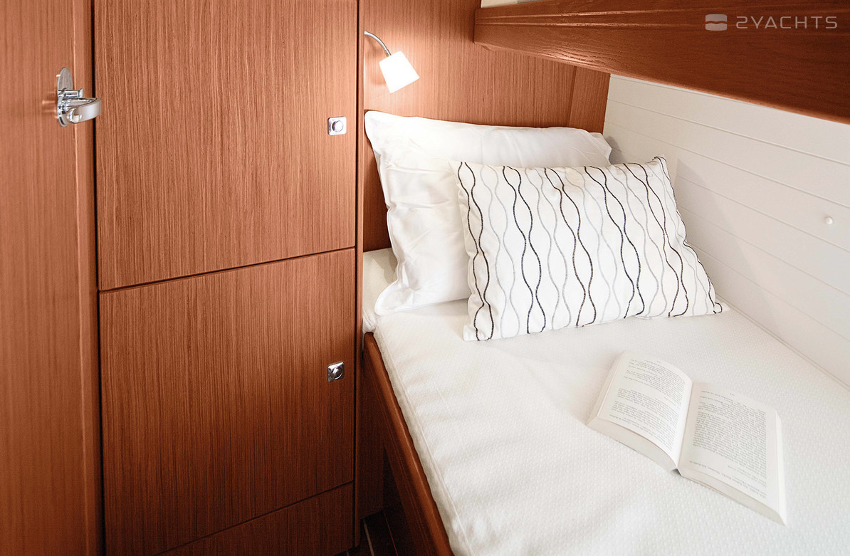 Pour la détente, il y a des chaises longues sur le toit de la superstructure, ainsi qu'une salle à manger dans le cockpit avec un canapé en U et une table pliante, directement à partir de laquelle vous pouvez vous rendre à la traverse pliante avec un entraînement hydraulique, offrant un accès sûr à l'eau. Deux barres permettent au skipper de prendre une position avec la meilleure visibilité et de diriger confortablement le yacht indépendamment de l'amure. Le salon a une salle à manger, un petit lieu de travail, ainsi qu'une cuisine avec cuisinière à gaz, réfrigérateur, double évier, grill, four et un endroit pour stocker les vivres. Trois, quatre ou cinq cabines doubles sont disponibles au choix. La cabine du propriétaire a reçu un grand lit double, une armoire avec un coffre-fort intégré et une salle de bains séparée avec une douche complète. Au total, le yacht, y compris l'équipage, peut accueillir jusqu'à 10 personnes.