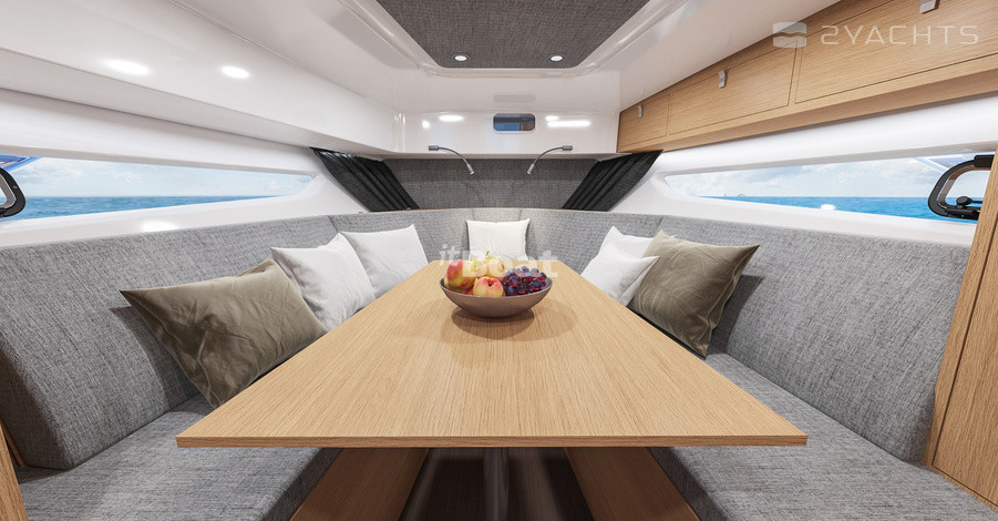 Le constructeur équipe le yacht de deux centrales hors-bord d'une puissance totale de 700 ch. Avec eux, le navire, conçu pour les croisières côtières, atteint des vitesses allant jusqu'à 40 nœuds.