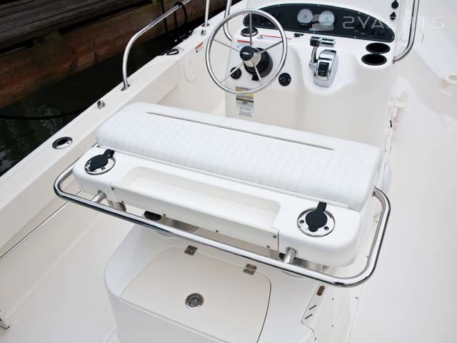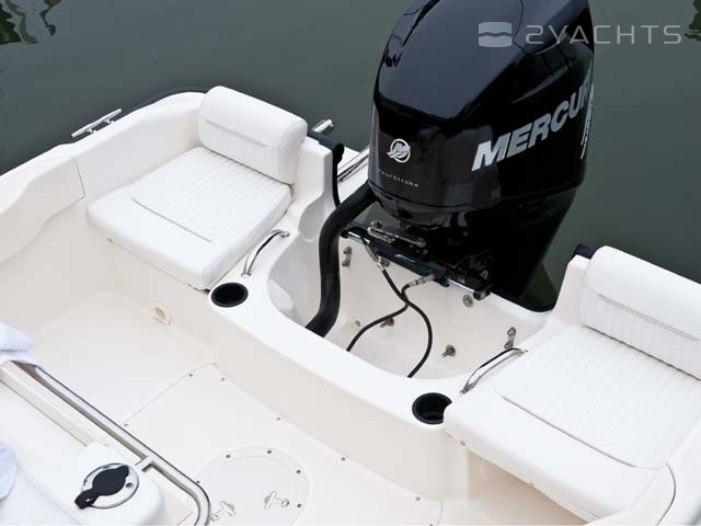 À l'arrière du Boston Whaler 190 Outrage, il y a deux fauteuils moelleux et, à tribord, une plate-forme d'accès à l'eau. Le modèle est équipé d'un moteur hors-bord d'une puissance de 150 ou 200 ch. Son approvisionnement en carburant est limité à 220 litres.