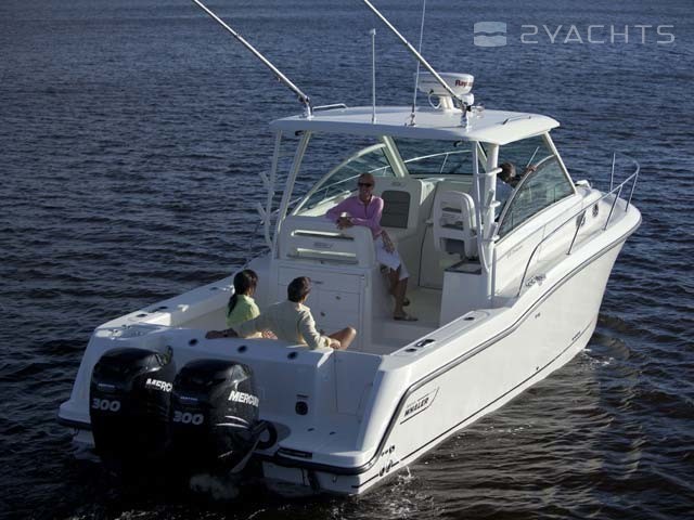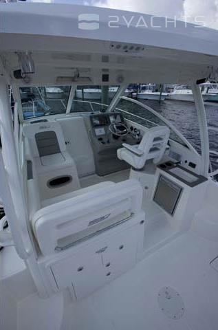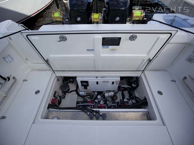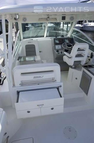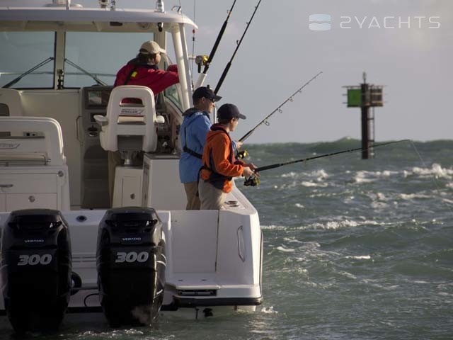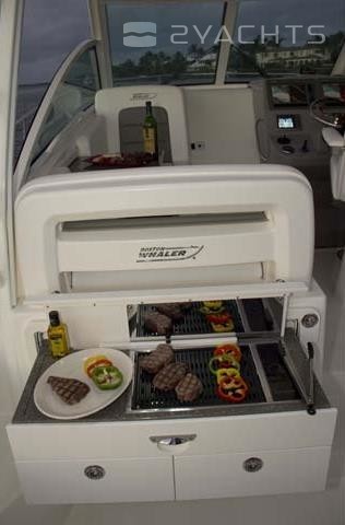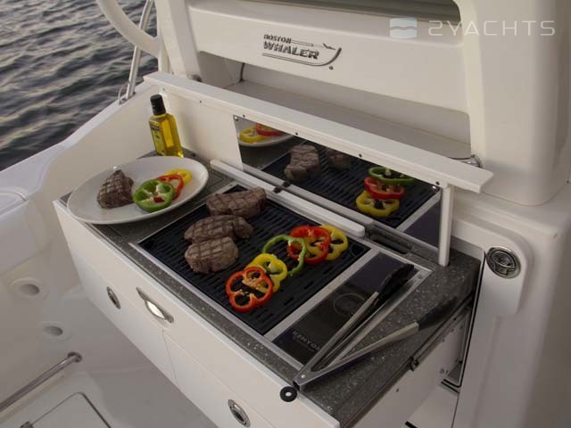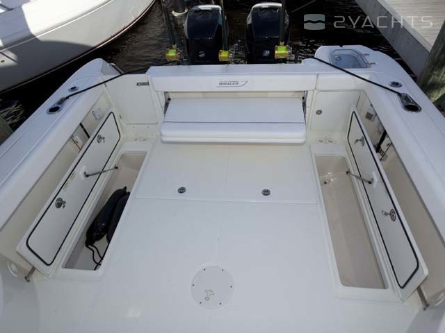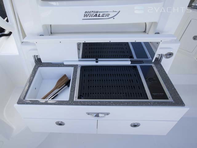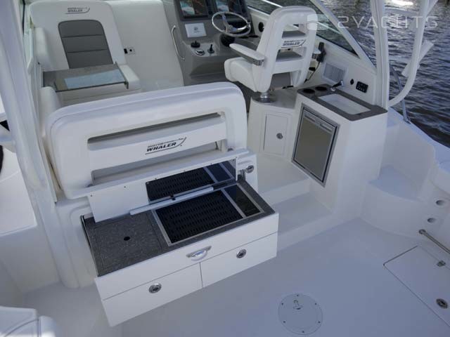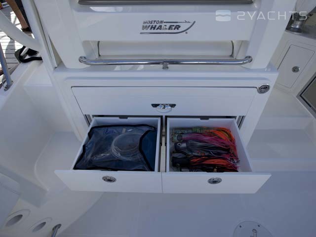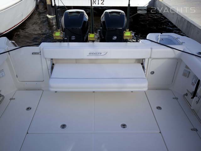 La poupe Boston Whaler 315 Conquest a un siège rétractable pour plusieurs personnes et deux casiers montés au sol. Un aérateur est situé sur le côté gauche, et sur le côté droit il y a un passage vers la plate-forme pour accéder à l'eau.