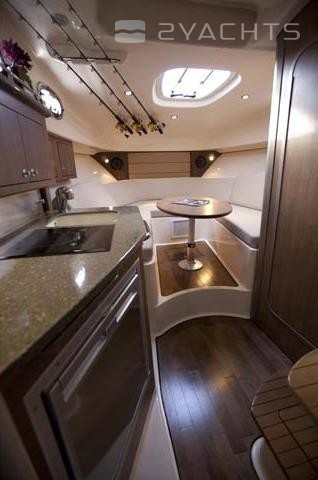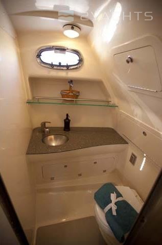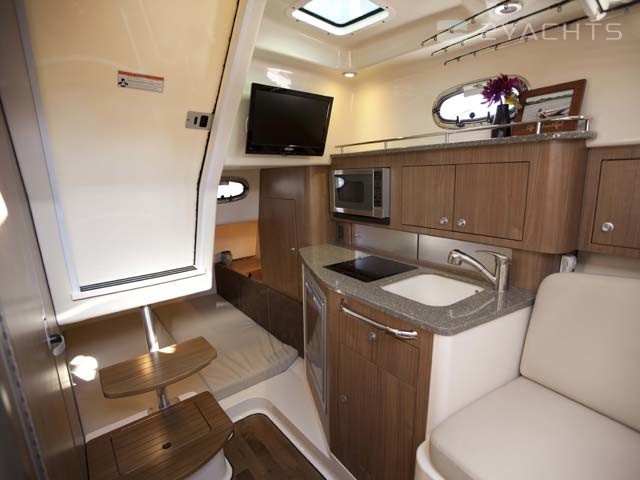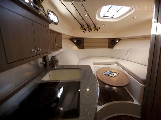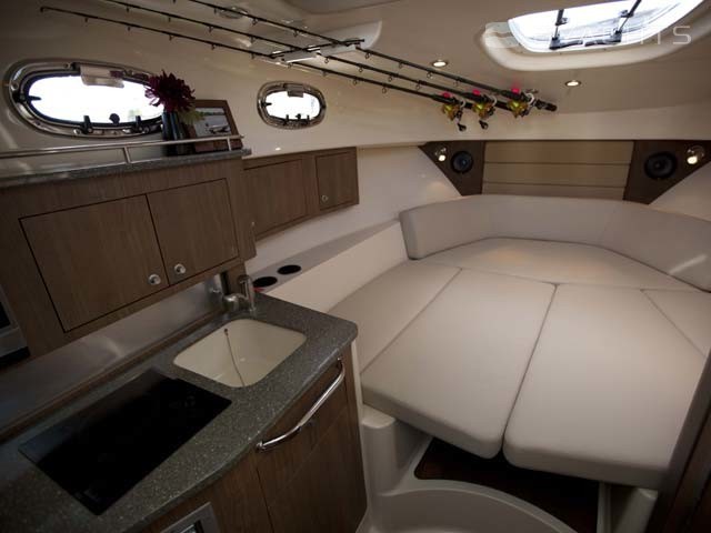 À gauche du panneau de commande se trouve une porte menant à la cabine. Il est équipé d'un canapé d'angle transformable en lit double, d'une table amovible compacte, d'une armoire et de tiroirs suspendus. Du côté bâbord il y a une cuisine avec un évier, un réfrigérateur et un four. Dans une pièce séparée côté tribord est équipée une salle de bain.