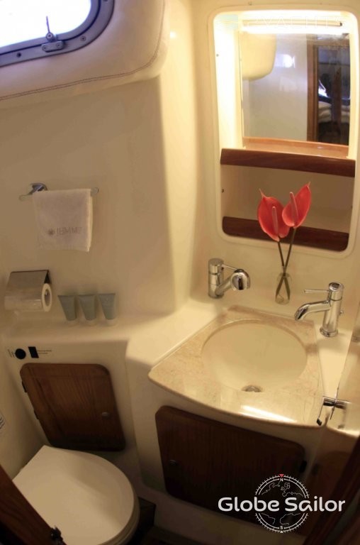 Le navire a une plate-forme d'arc ouverte, qui peut être accédée par des passages avec des balustrades métalliques situées le long des côtés. Il dispose de trois chaises longues, dont une avec un casier spacieux. Le cockpit a un cockpit fermé avec un toit rigide équipé d'un poste de capitaine avec un volant réglable et deux sièges pivotants, ainsi qu'un canapé d'angle et un bain de soleil moelleux pour plusieurs personnes.