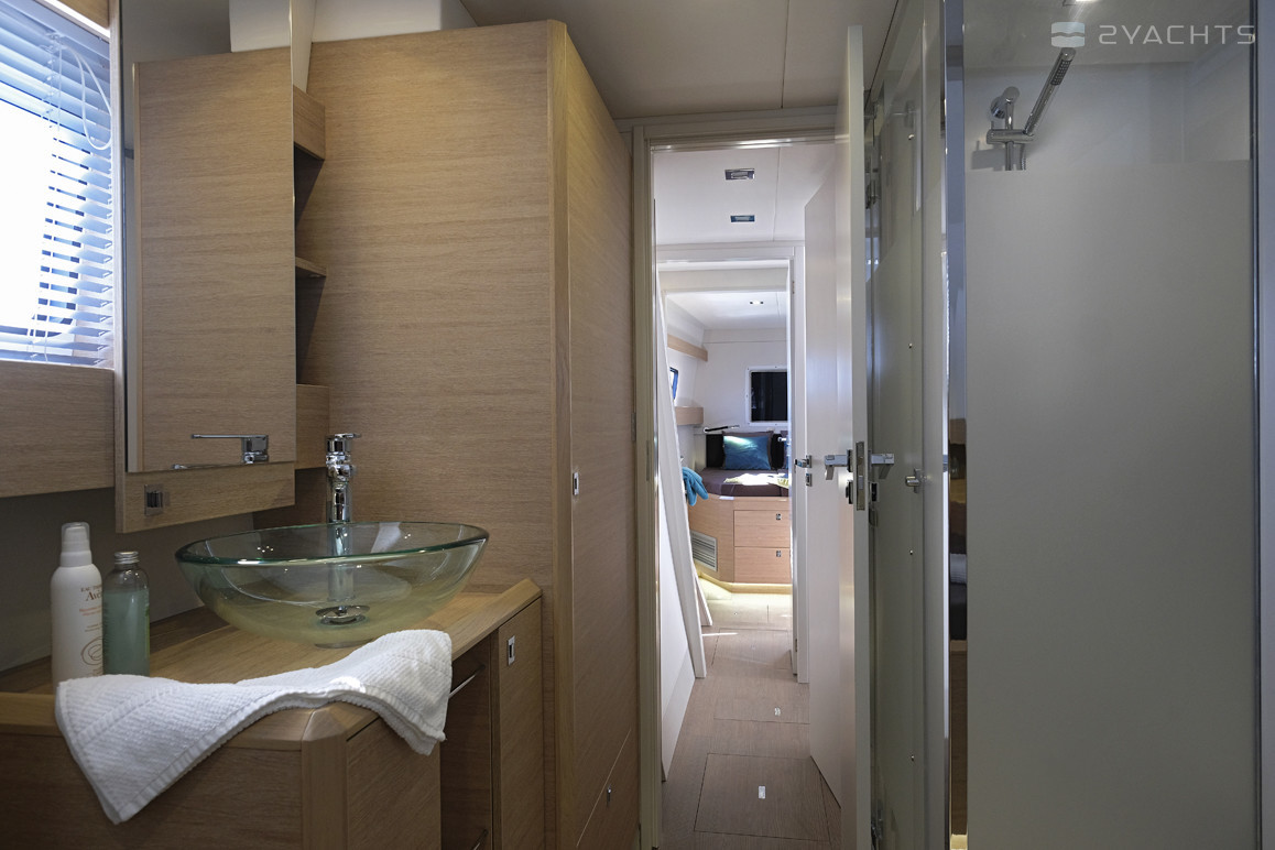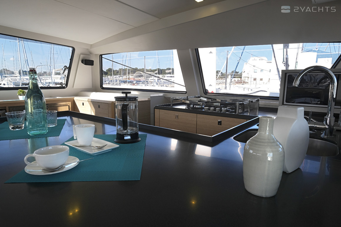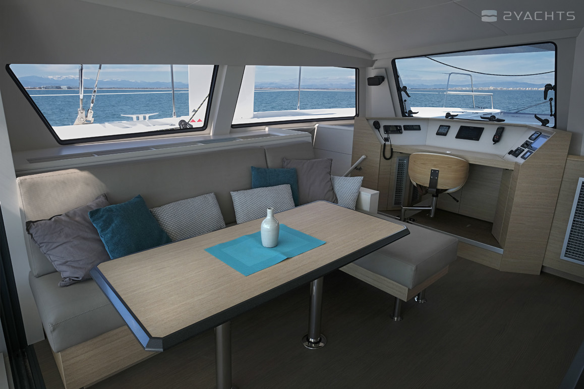 Sur bâbord, à l'intérieur du cockpit, il y a un poste de capitaine avec un panneau de commande électronique, un volant réglable et une chaise pivotante, et derrière il y a un canapé d'angle moelleux et deux tables à manger en bois. Du côté droit, il y a une cuisine avec un réfrigérateur, un four et des fours électriques, un évier et plusieurs boîtes pour la nourriture.