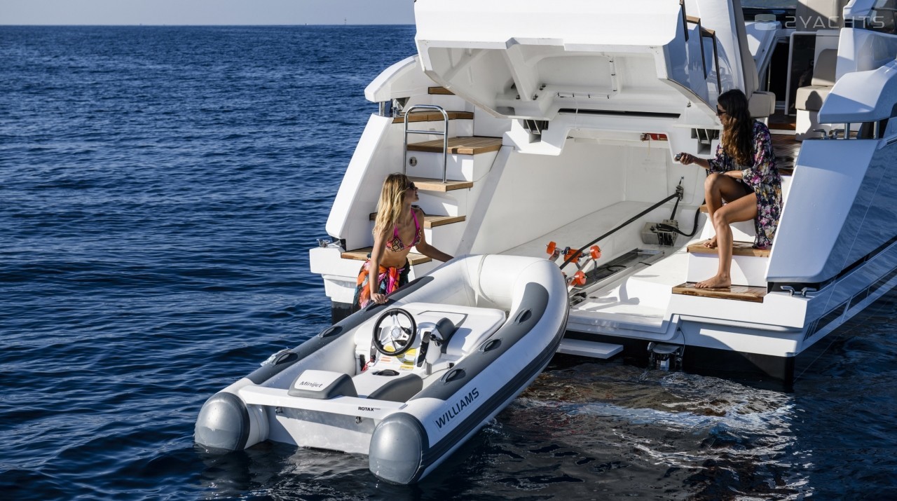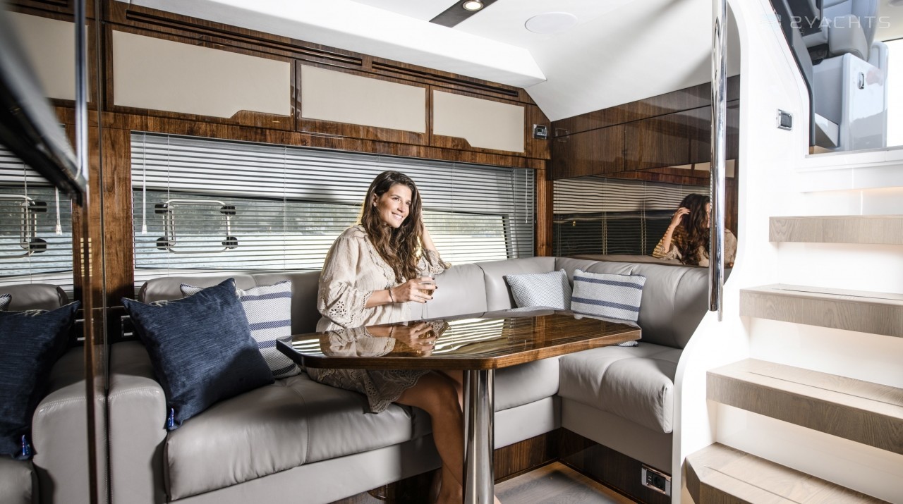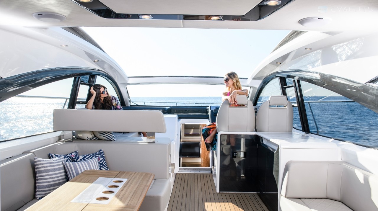 À l'arrière, il y a une zone de loisirs avec un lit de bronzage, en dessous il y a un garage pour l'appel d'offres. Dans le cockpit il y a une salle à manger avec une table pliante et un grand canapé moelleux, un vebar et un grill. Par des portes coulissantes en verre, vous pouvez accéder au salon, dans lequel il y a un poste de commande sur le côté tribord et un canapé et un coin repas sur le podium sur le côté gauche.