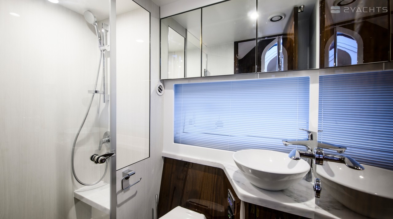 Sur le yacht, il existe deux options pour l'installation des moteurs. Deux moteurs Volvo Penta D6-IPS 600 de 440 ch chacun, permet des vitesses allant jusqu'à 32 nœuds. Deux moteurs diesel D6-IPS 650 d'une puissance de 480 ch - jusqu'à 33 nœuds. Le yacht est certifié (CE) B et est destiné à la mer.