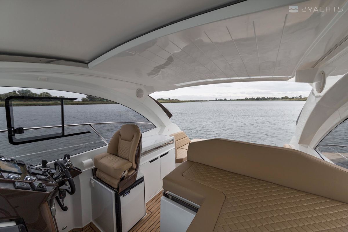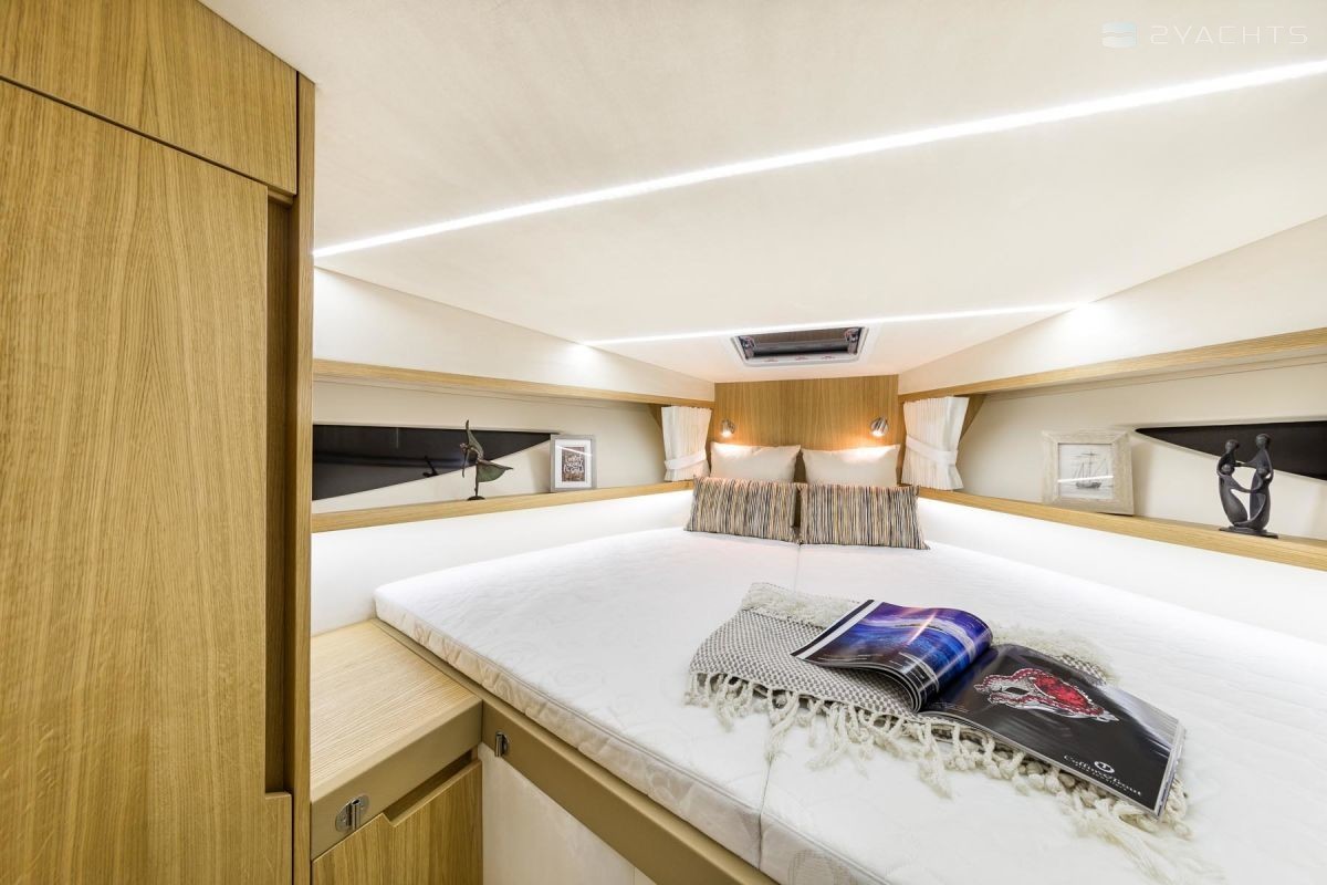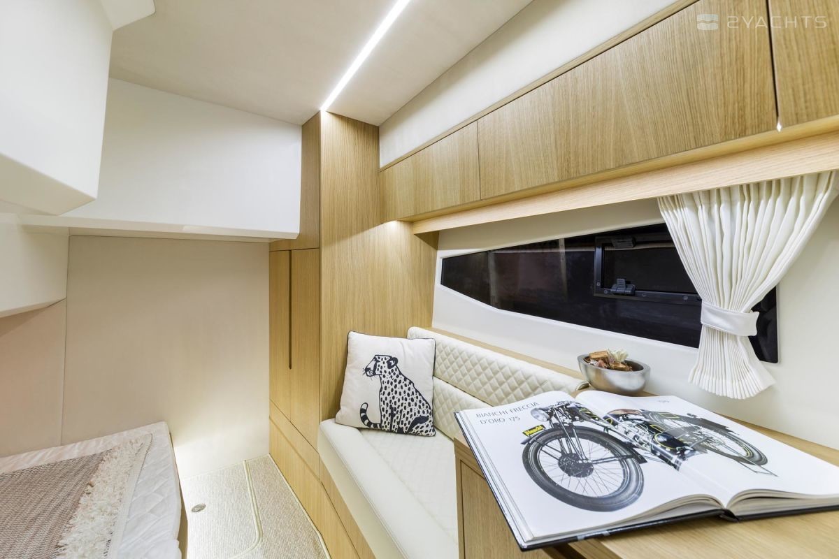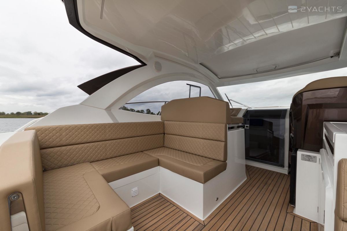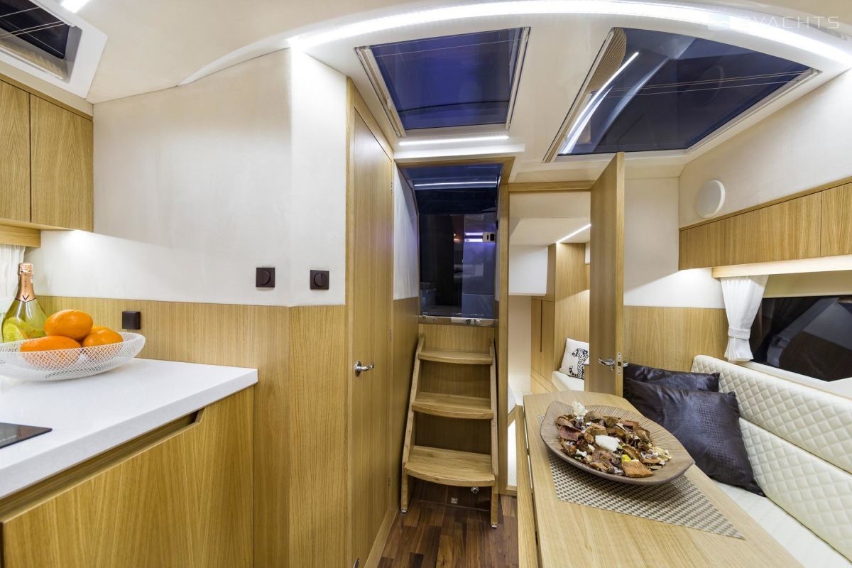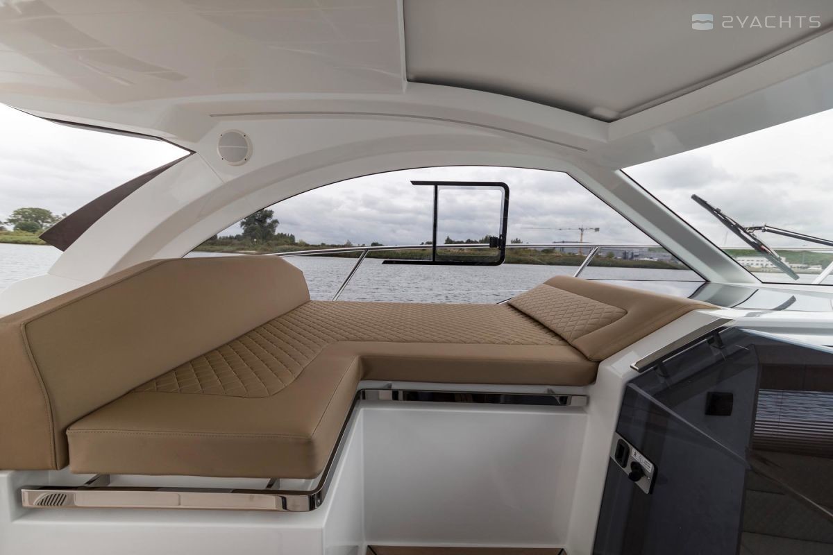 Sur le pont, le concept d'un club de plage avec une chaise longue pliante et des canapés sur les côtés est réalisé. Le salon est équipé d'une cuisine et d'un bar, et à l'avant du navire, il y a un espace de bronzage supplémentaire avec deux chaises longues. En option, une plateforme de bain allongée avec une douche et une table de cockpit en plastique peut être installée sur le yacht. La chaise du capitaine est transformée pour la commodité de s'asseoir et de se tenir debout, et un toit dur protège lui et les passagers en cas de mauvais temps.