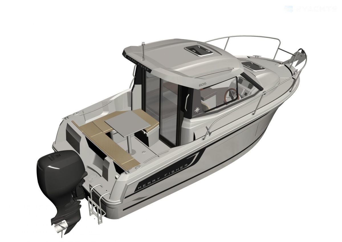 Sur la partie ouverte du cockpit, il y a un canapé d'angle pour plusieurs personnes, qui peut être transformé en chaises longues et casiers. Dans le sol à côté, il y a un support pour une table à manger compacte.Des deux côtés du Jeanneau Merry Fisher 605 il y a des garde-corps en métal et à gauche il y a un passage menant à la poupe. Il est équipé d'une plate-forme avec une échelle pliante pour l'accès à l'eau et d'un support métallique pour le remorquage.