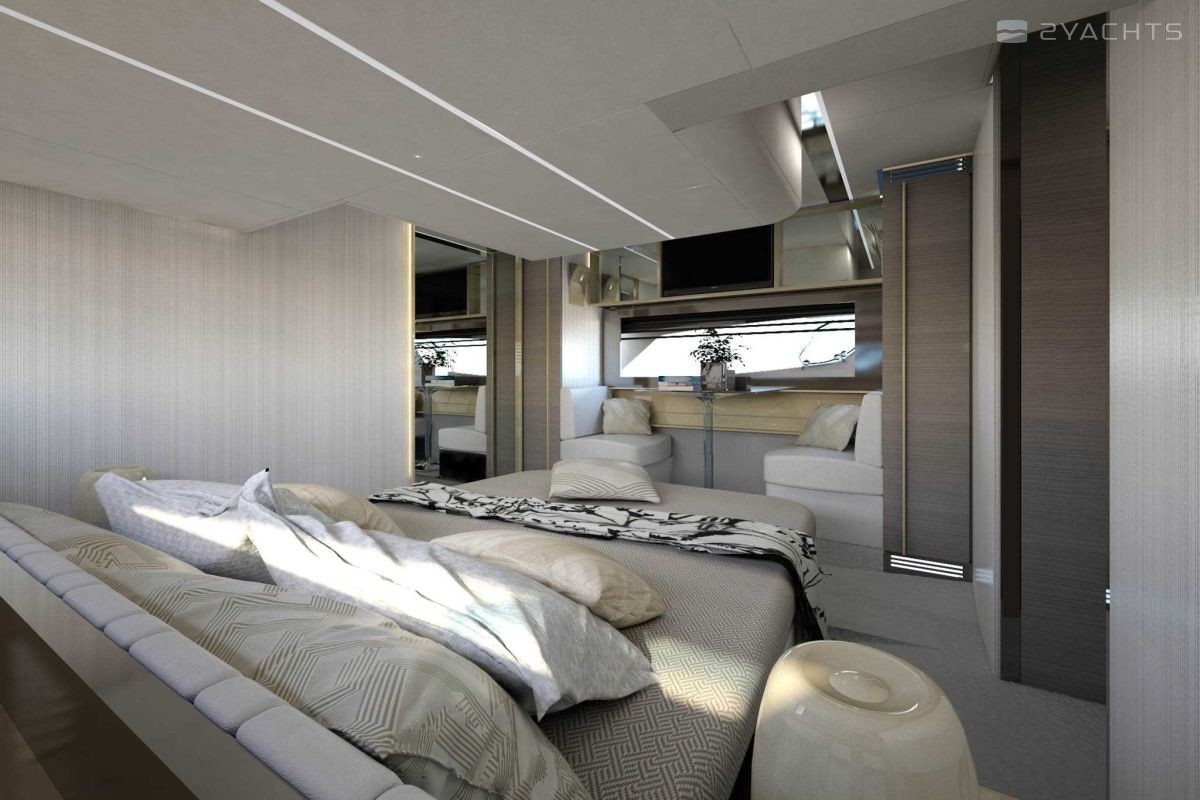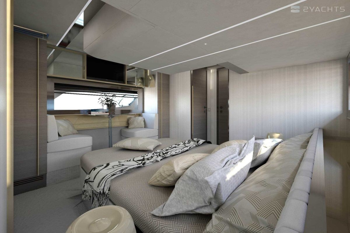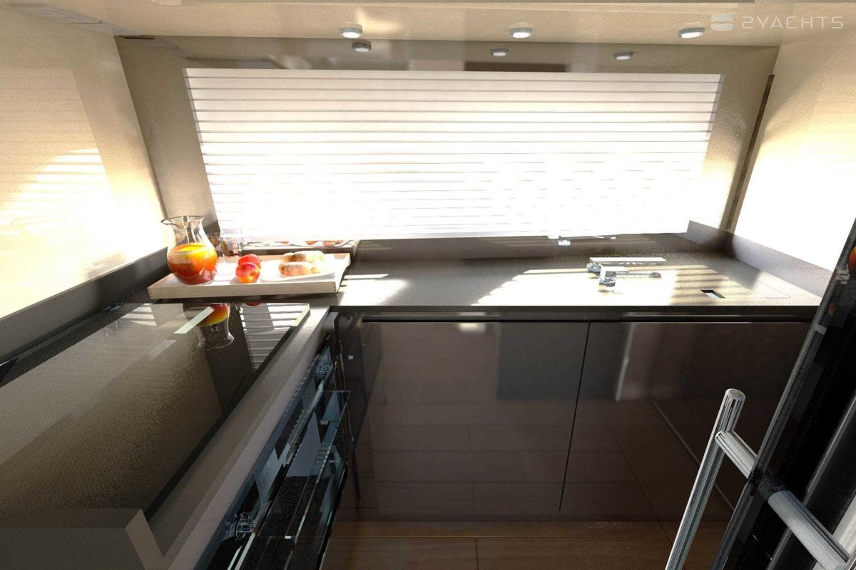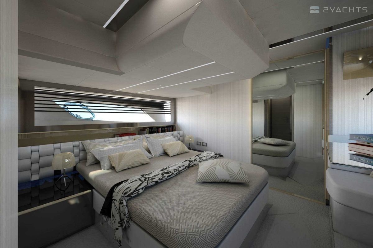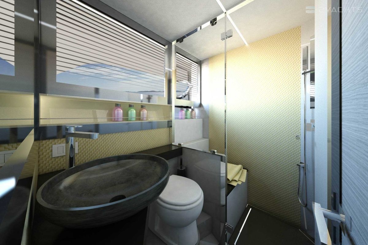 L'agencement du pont inférieur est proposé en deux versions. La norme comprend une salle à manger et deux cabines: un maître dans toute la largeur du yacht et VIP à l'avant. La deuxième option consiste à remplacer la salle à manger par une troisième cabine, qui peut accueillir les invités ou l'équipage. Il a une entrée séparée du pont, l'intérieur est dominé par le gris et ses teintes sombres contrastées.