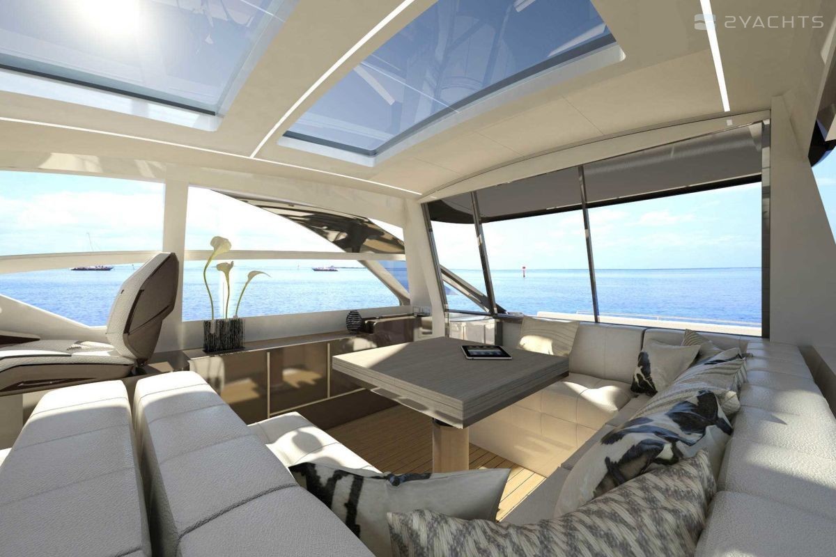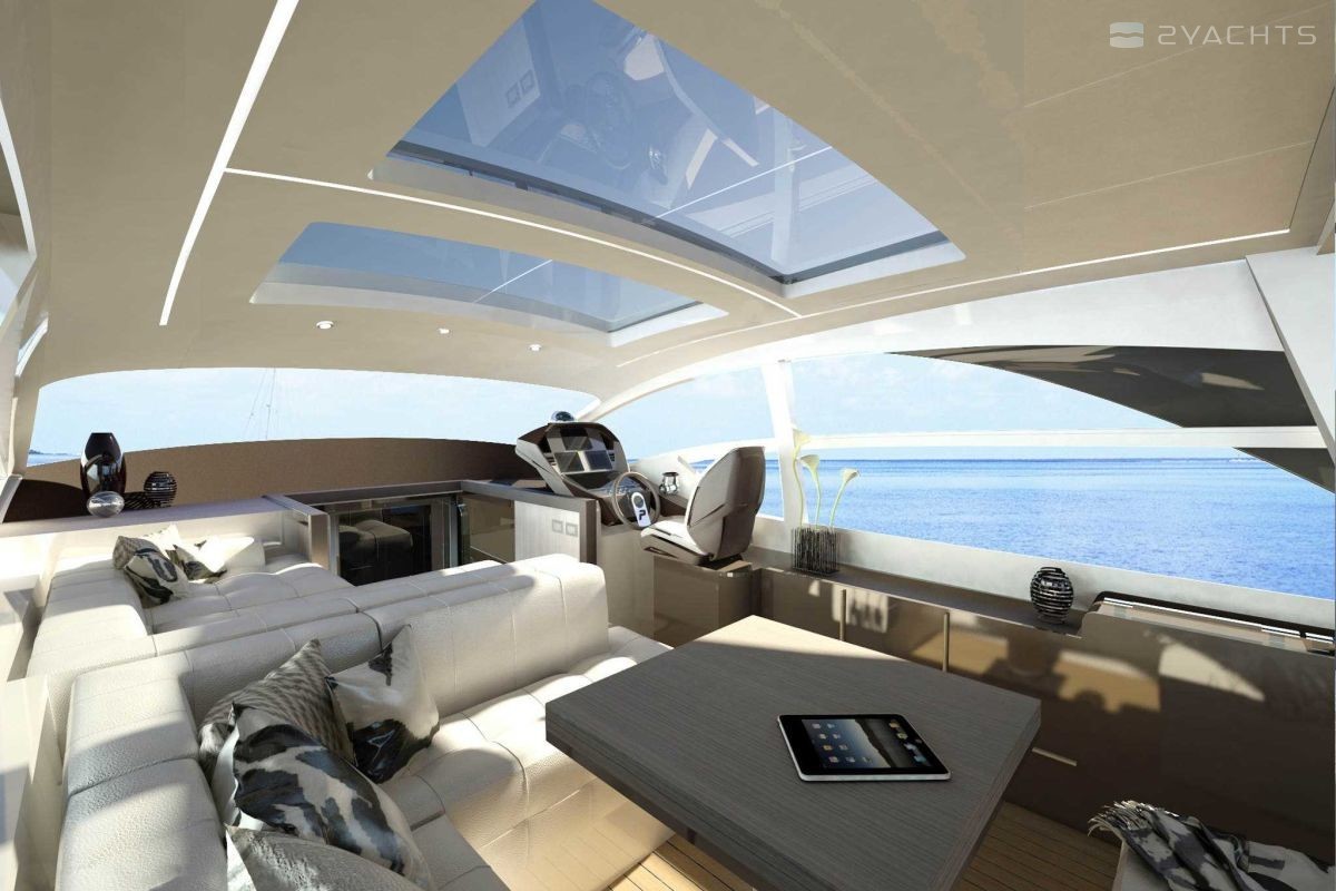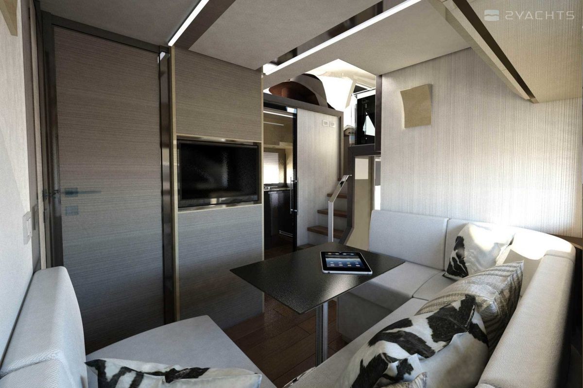 Sur le pont principal, il y a: un salon, un poste de contrôle et un coin salon. Ils sont séparés par des cloisons coulissantes en verre, dont un système spécial vous permet d'ouvrir dans la chaleur et de fermer à l'automne. Au toit rigide, la partie vitrée du toit se déplace. La superstructure a un vitrage panoramique et des ailes intégrées qui protègent le cockpit. La plate-forme hydraulique à l'arrière descend sous le niveau de l'eau d'un demi-mètre. Sur celui-ci, vous pouvez installer une balustrade de protection avec un filet et la transformer en piscine d'eau de mer, ce qui est pratique et sûr pour les enfants. Le garage accueille une annexe Williams de 2,8 mètres, qui est lancée à partir de la plateforme de natation.