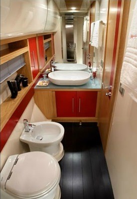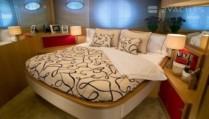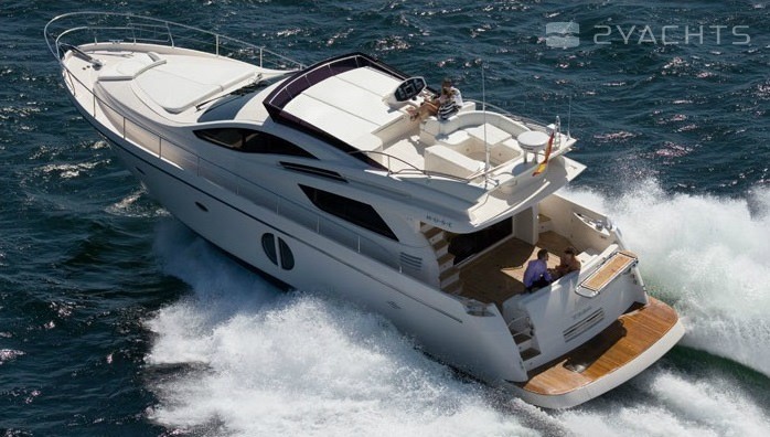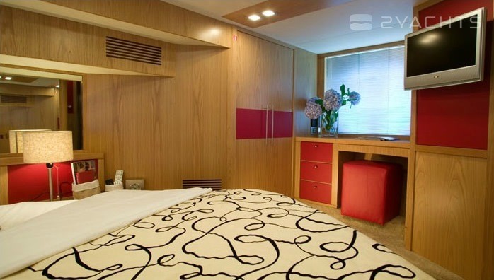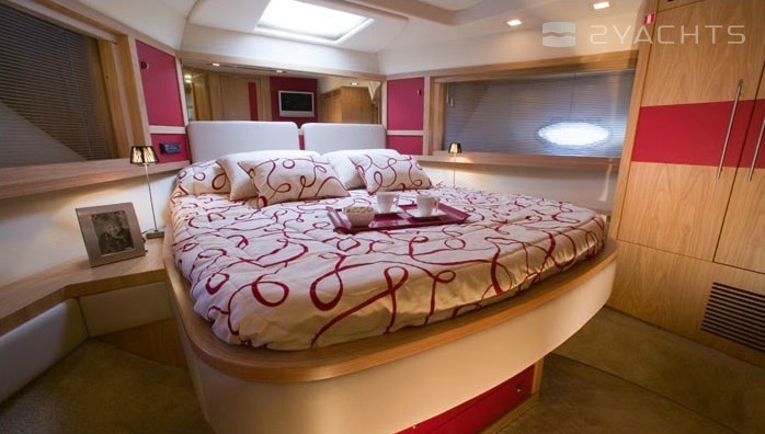 Le flybridge accueille: des chaises longues pour bronzer à l'avant, une salle de contrôle et un fauteuil double à tribord, un coin barbecue avec une table, un réfrigérateur, un évier et un canapé à l'arrière. Le salon est divisé en deux parties: un poste de contrôle et une cuisine sur une plate-forme surélevée, jusqu'à la salle à manger depuis des canapés pliants et une table. La sortie est séparée par une porte coulissante à rideaux. Il y a une zone de bronzage avec des chaises longues douces sur le nez, dans le cockpit il y a une échelle pour grimper sur le flybridge, un canapé et un accès à la plateforme de natation. La station de contrôle est équipée d'un pilote automatique, d'un GPS, d'un échosondeur, d'un propulseur d'étrave et d'un radar. L'aménagement du pont inférieur est représenté par deux salles de bains, une cabine principale à l'avant et deux cabines invités sur les côtés.
