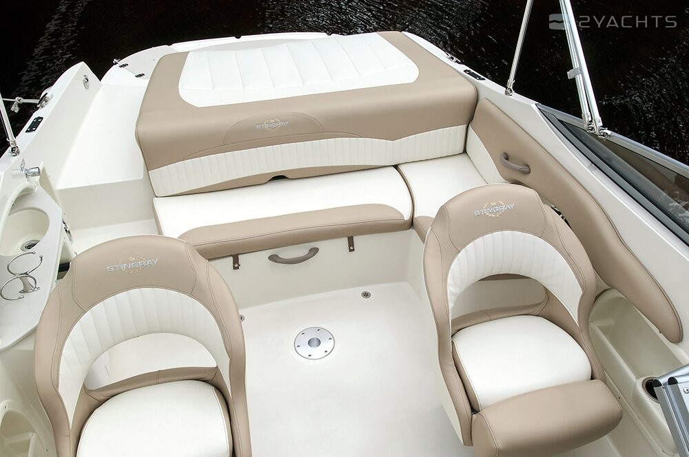 Le bow-rider sportif Stingray 215LR a été présenté en 2013. Le navire planant fait partie de la gamme Sport Decks. L'extérieur du boîtier en fibre de verre est créé dans le style traditionnel, même en standard, il y a des graphiques sur le boîtier.