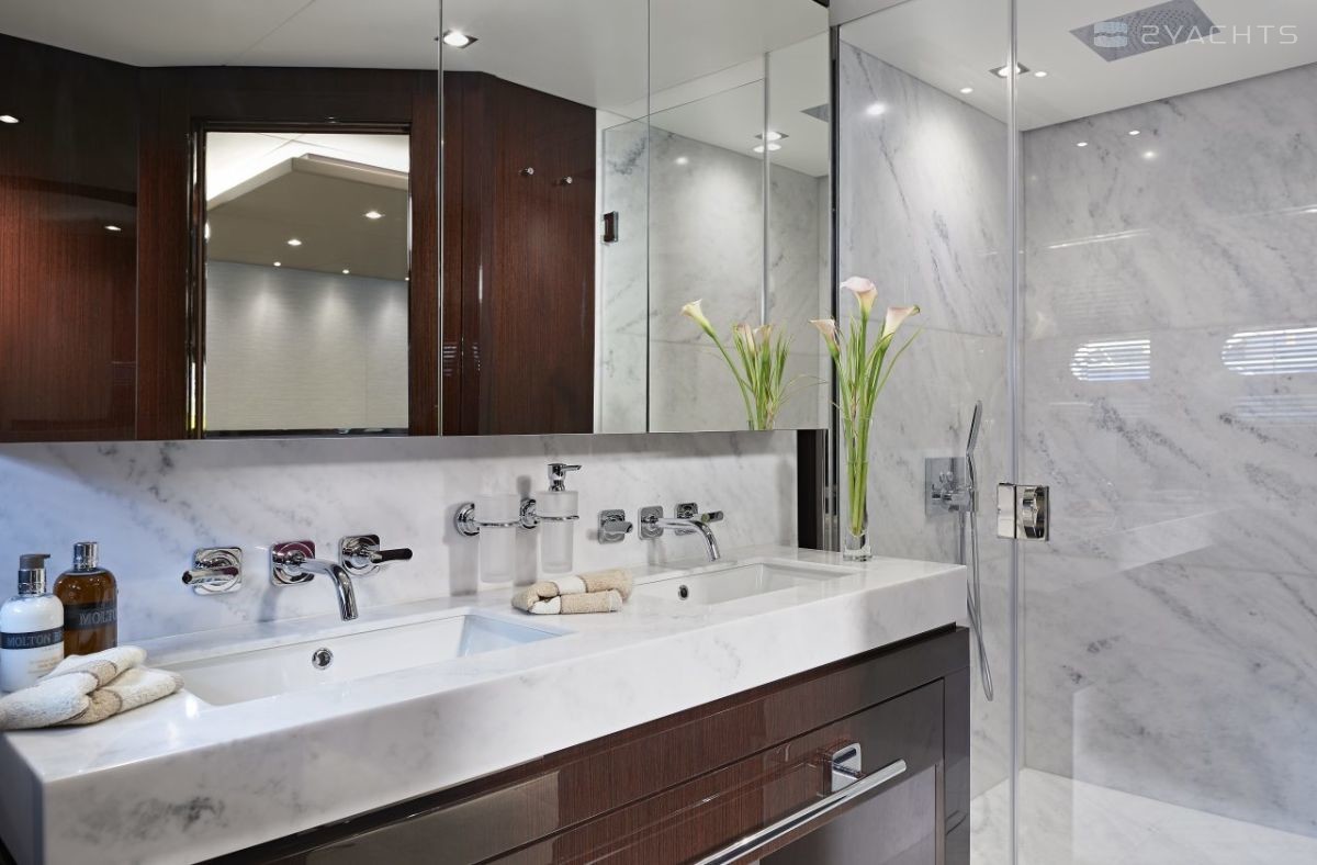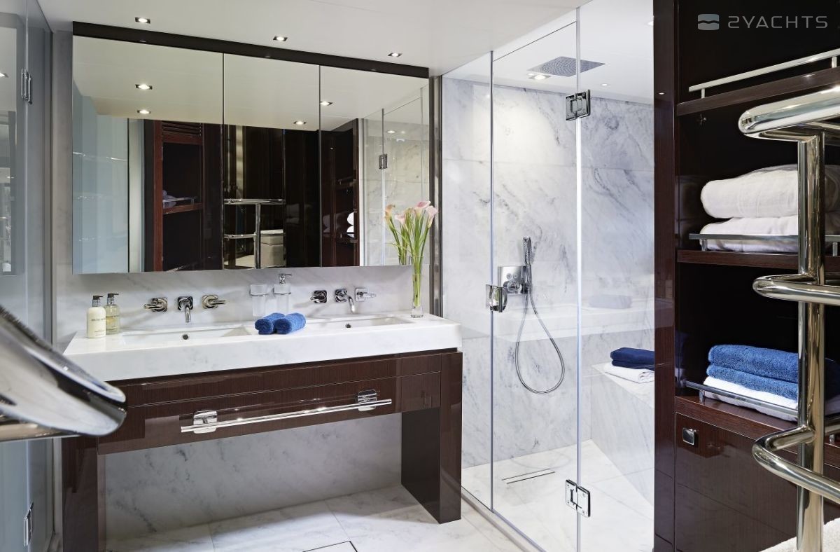 La cabine principale sur le pont principal du yacht 95 a une disposition à deux niveaux. Selon les préférences du propriétaire, le chantier naval propose un choix de trois ou quatre cabines invités sur le pont inférieur. Une grande cuisine avec un espace de travail et de service est située entre l'échelle, la salle à manger et la salle de bain. En outre, il dispose d'une sortie séparée pour la cuisine, de sorte que l'équipage invisible aux invités pénètre dans leurs locaux.